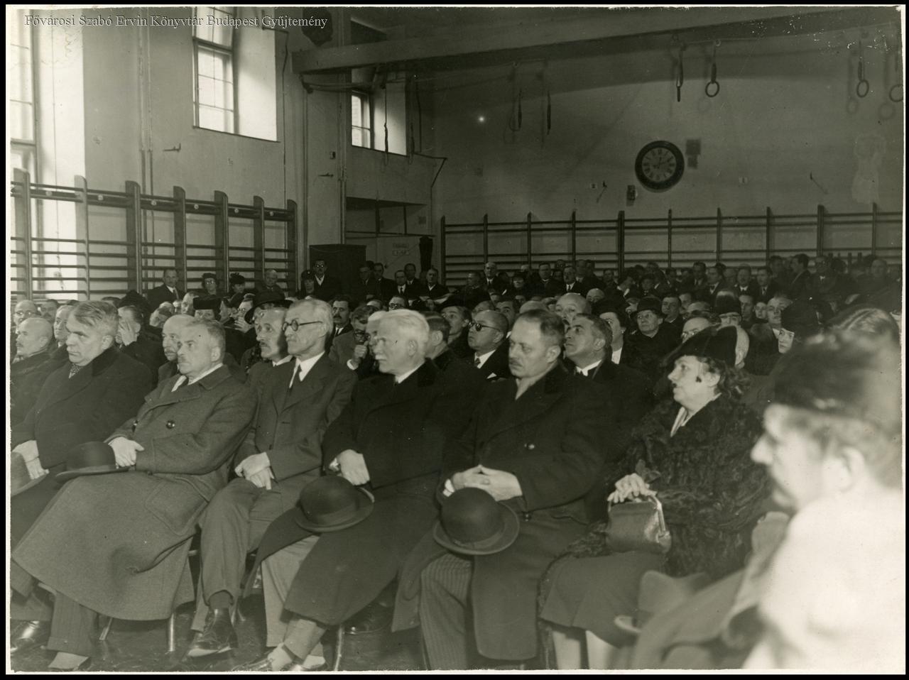 [Az Országos Polgári Iskolai Tanáregyesület közgyűlésének hallgatósága a VII. kerület Kertész utcai fiúiskola tornatermében, 1933. november 5.]