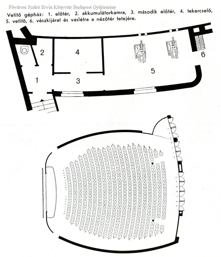 Földszinti és emeleti alaprajz, metszet, perspektívikus rajz a mozibelsőről, a vetítőgépház tervrajza, a földszinti üléselrendezés alternatív megodása. A volt Atrium, ma Május 1. mozi 1935-ben épült Kozma Lajos tervei alapján, II., Mártírok útja 55.