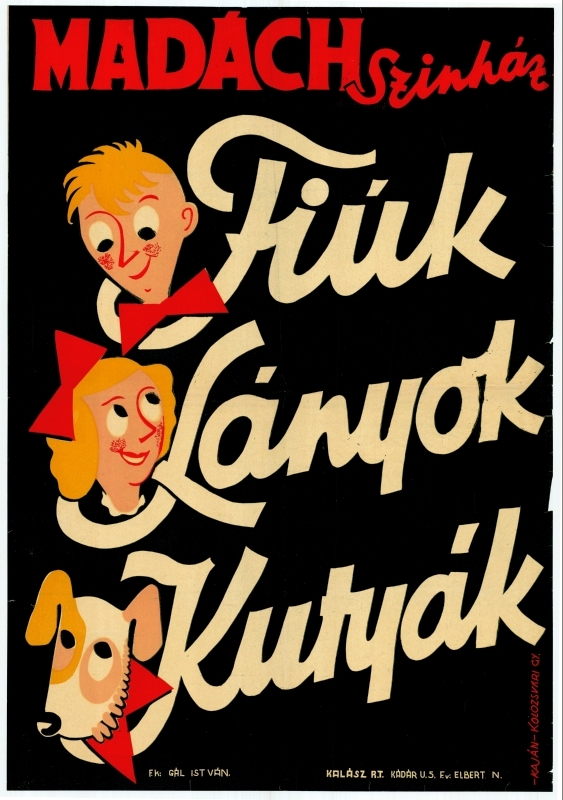 A Madách Színház színpadán 1947-ben előadott ,,Fiúk, lányok, kutyák" című darab grafikus reklámplakátja. A rendező Bálint György volt, a szereplők között Békés Rita, Ferrari Violetta, Dékány László és Rozsos István.