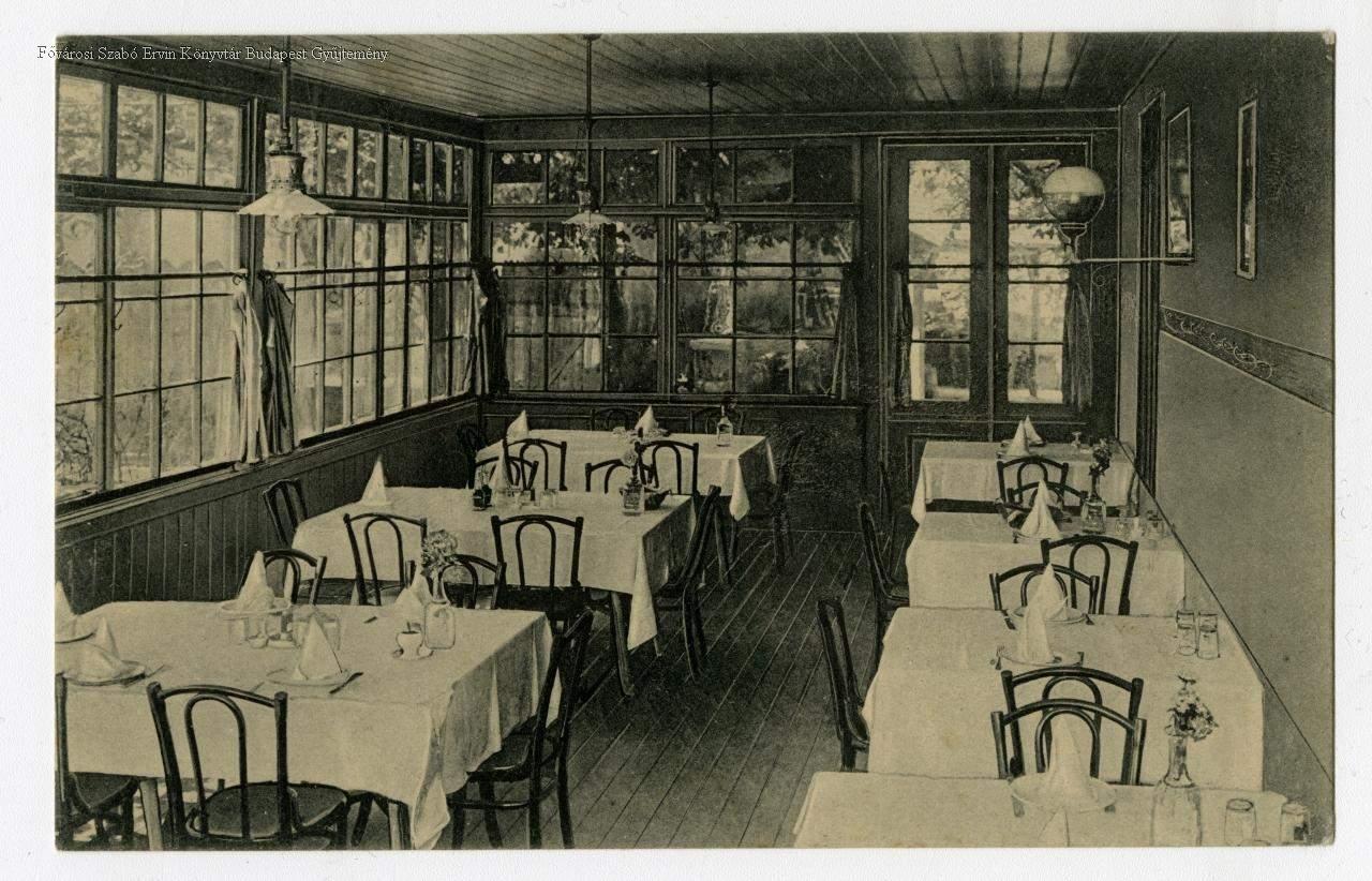 étterem, veranda, asztal, támlásszék, teríték, képes levelezőlap, belső felvétel, 1910-es évek
