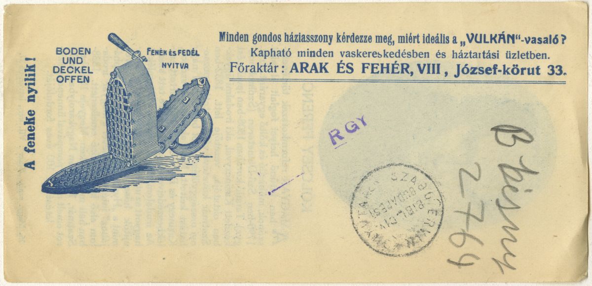 Minden gondos háziasszony kérdezze meg, miért ideális a "Vulkán vasaló"? Kapható minden vaskereskedésben és háztartási üzletben. A feneke nyílik! [A hátlapon]: Kölcsey Ferenc