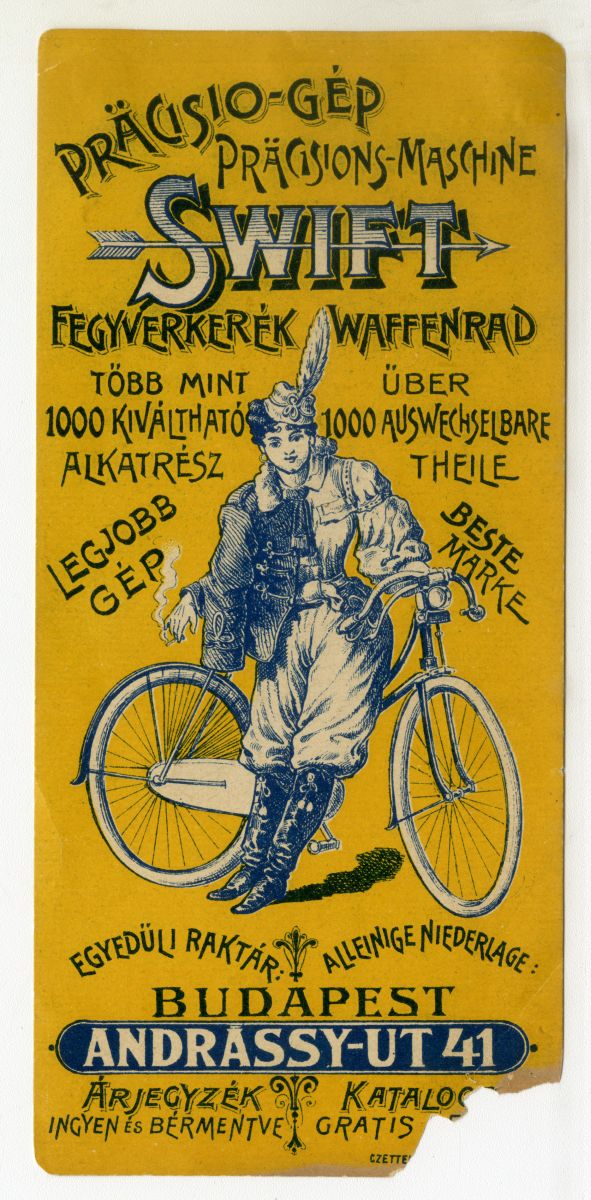 kerékpár, alkatrész, kerék, nő, dohányzás, cigaretta, ruházat, reklámnyomtatvány, kisnyomtatvány, aprónyomtatvány, számolócédula