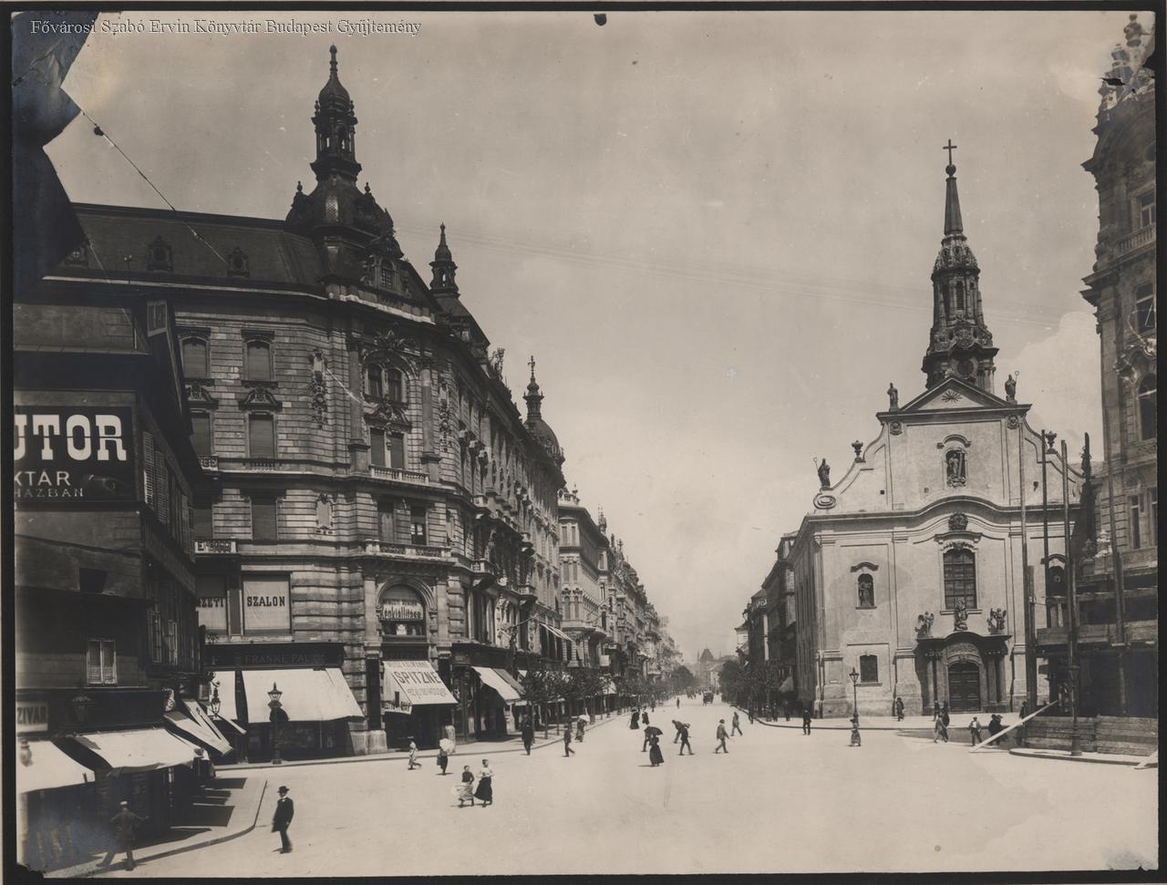 üzletház, lakóépület, templom, üzlet, ember, utcakép, 1900-as évek