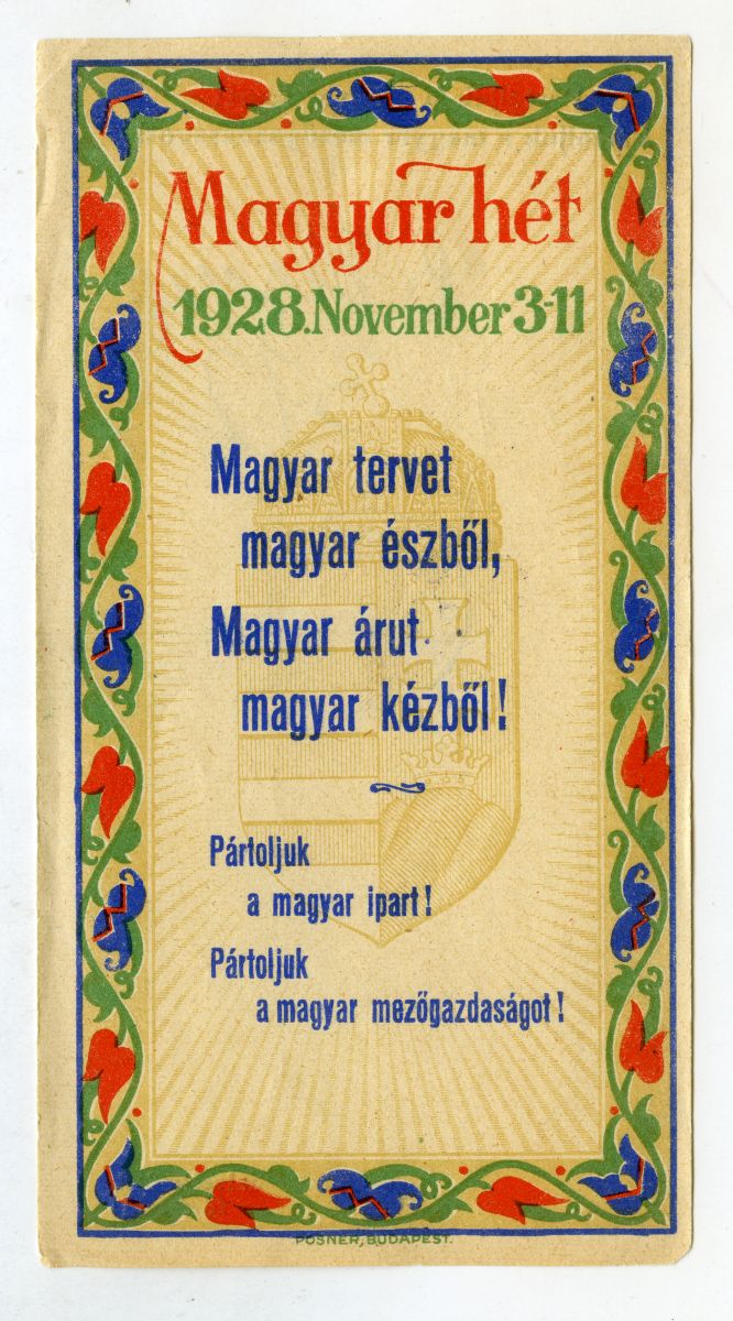 A hirdetés szövege: 1928. November 3-11. Magyar tervet magyar észből, Magyar árut magyar kézből! Pártoljuk a magyar ipart! Pártoljuk a magyar mezőgazdaságot!
