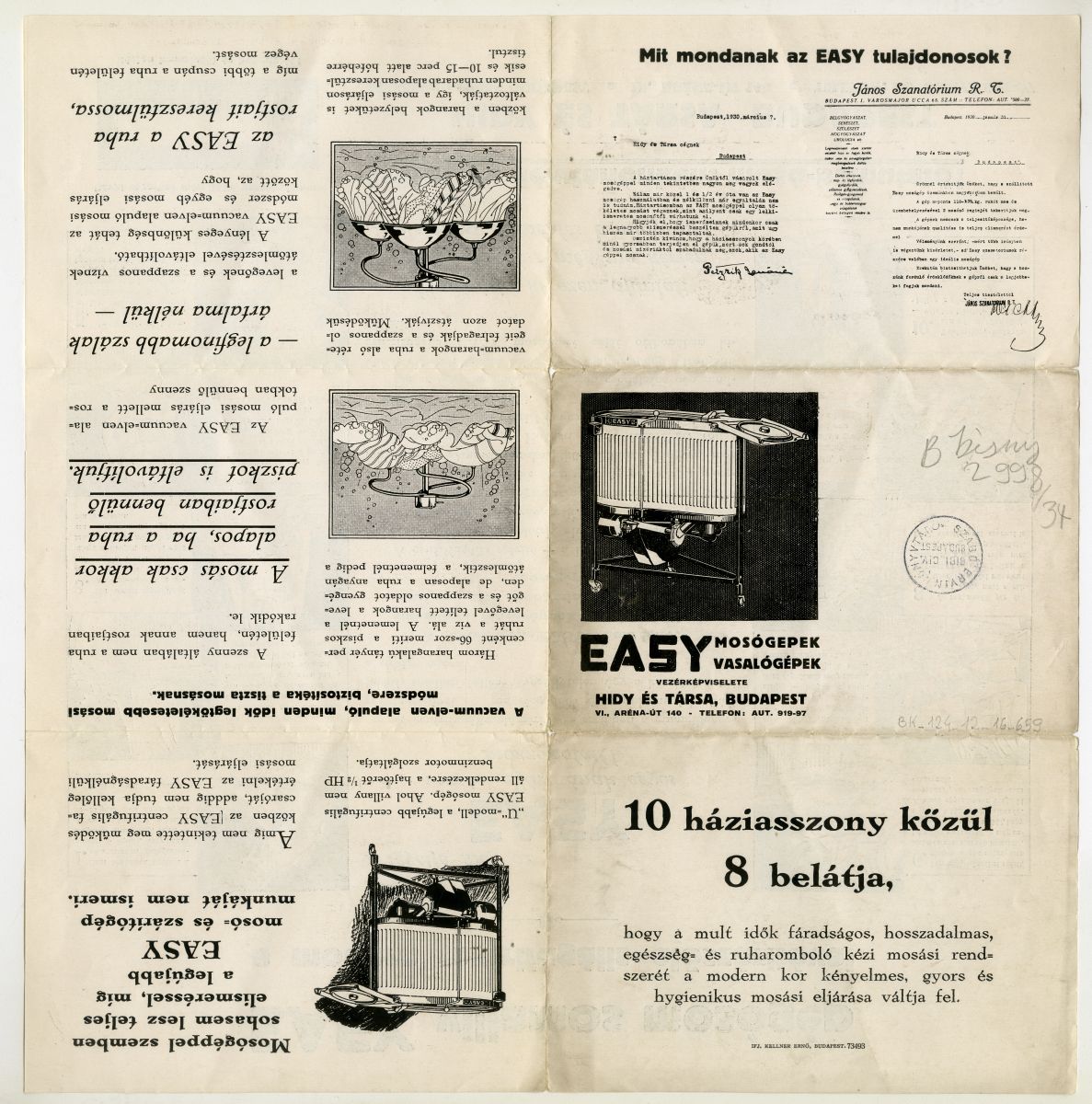 Easy mosógépek vasalógépek vezérképviselete Hidy és Társa, Budapest, VI., Aréna út 140. Telefon: aut 919-97. Mit mondanak az Easy tulajdonosok? (Dícsérő levelek a cégnek-halvány)
