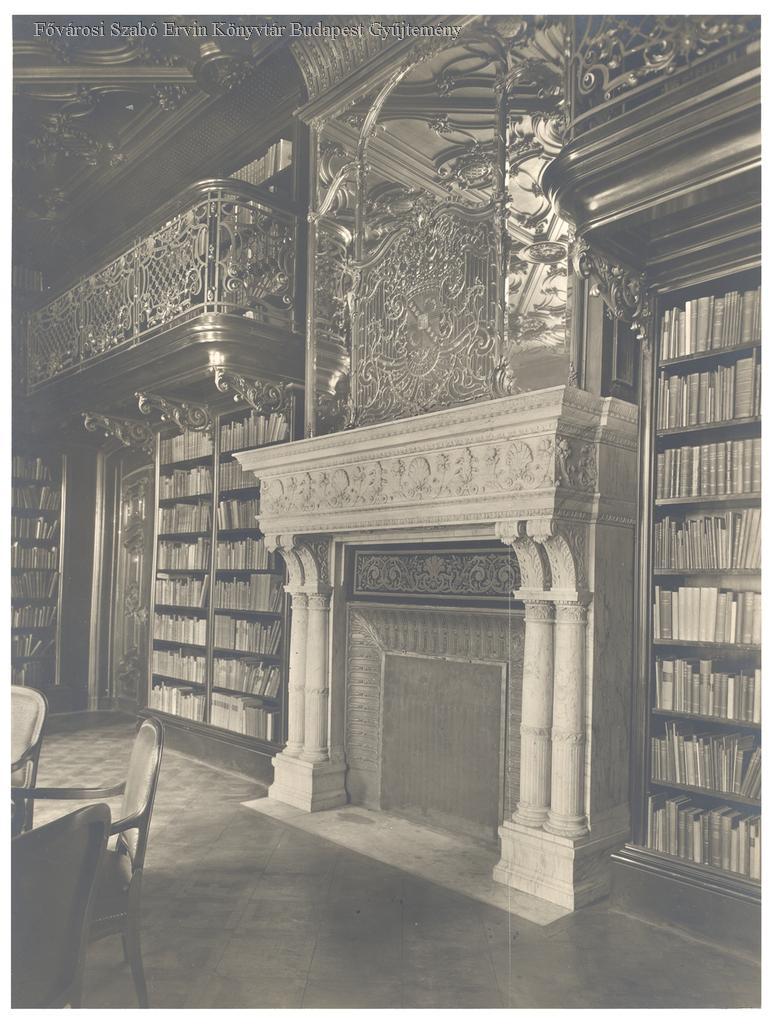 könyvtár, palota, bútor, parketta, könyvespolc, kandalló, díszítőelem, belső felvétel, 1931