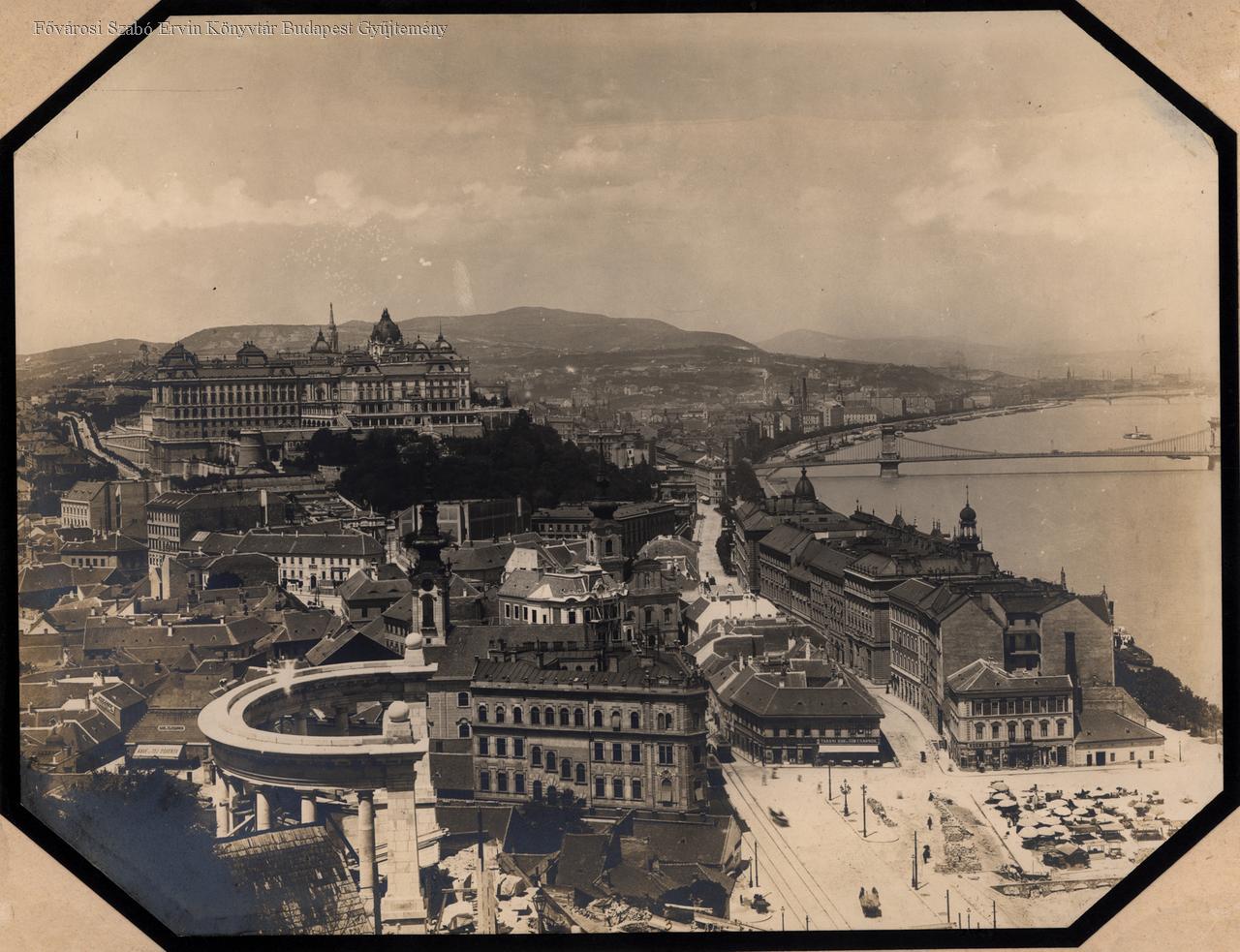 A Gellért-szobor építése folyik, környezetében épületeket bontanak. A Szent Katalin-templom mellett lakóház építkezése.