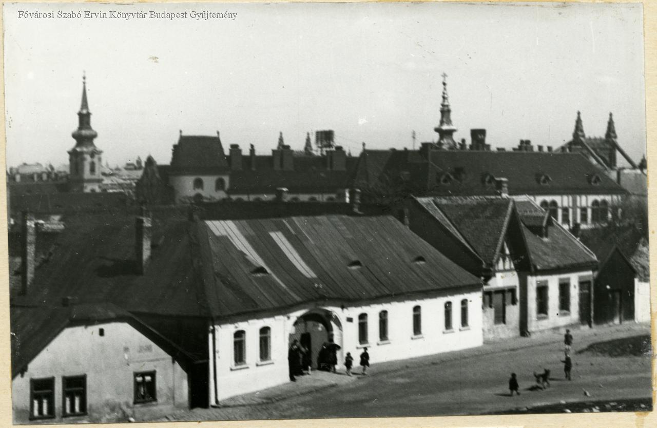 A vendéglő a 4. sz. házban volt, mögötte a Fehér Sas téri iskola, Erzsébet híd pilonjának csúcsai, a két tabáni templom tornya