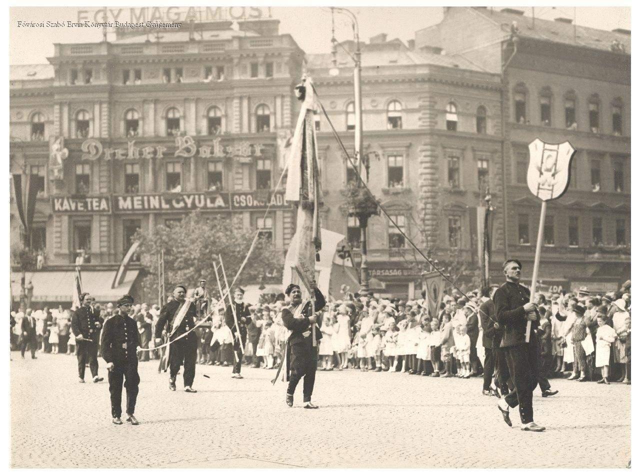 körmenet, katolikus egyház, történeti évforduló, szentek kultusza, keresztény ünnep, augusztus 20., felvonulás, ipartestület, kéményseprés, ünneplő ruha, zászló, 1930, Horthy-korszak, sajtófotó