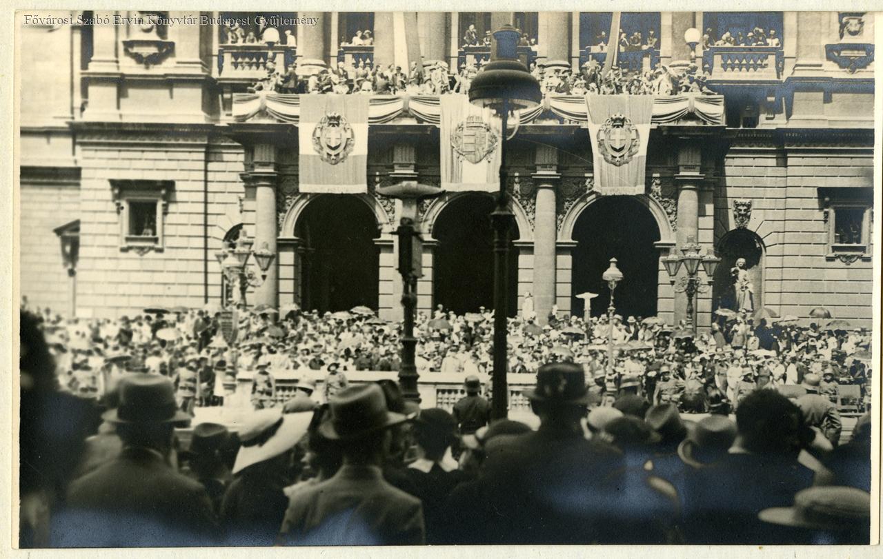 külső felvétel, Horthy-korszak, felvonulás, néptömeg, olaszok, katonaság, uralkodó, címer, zászló