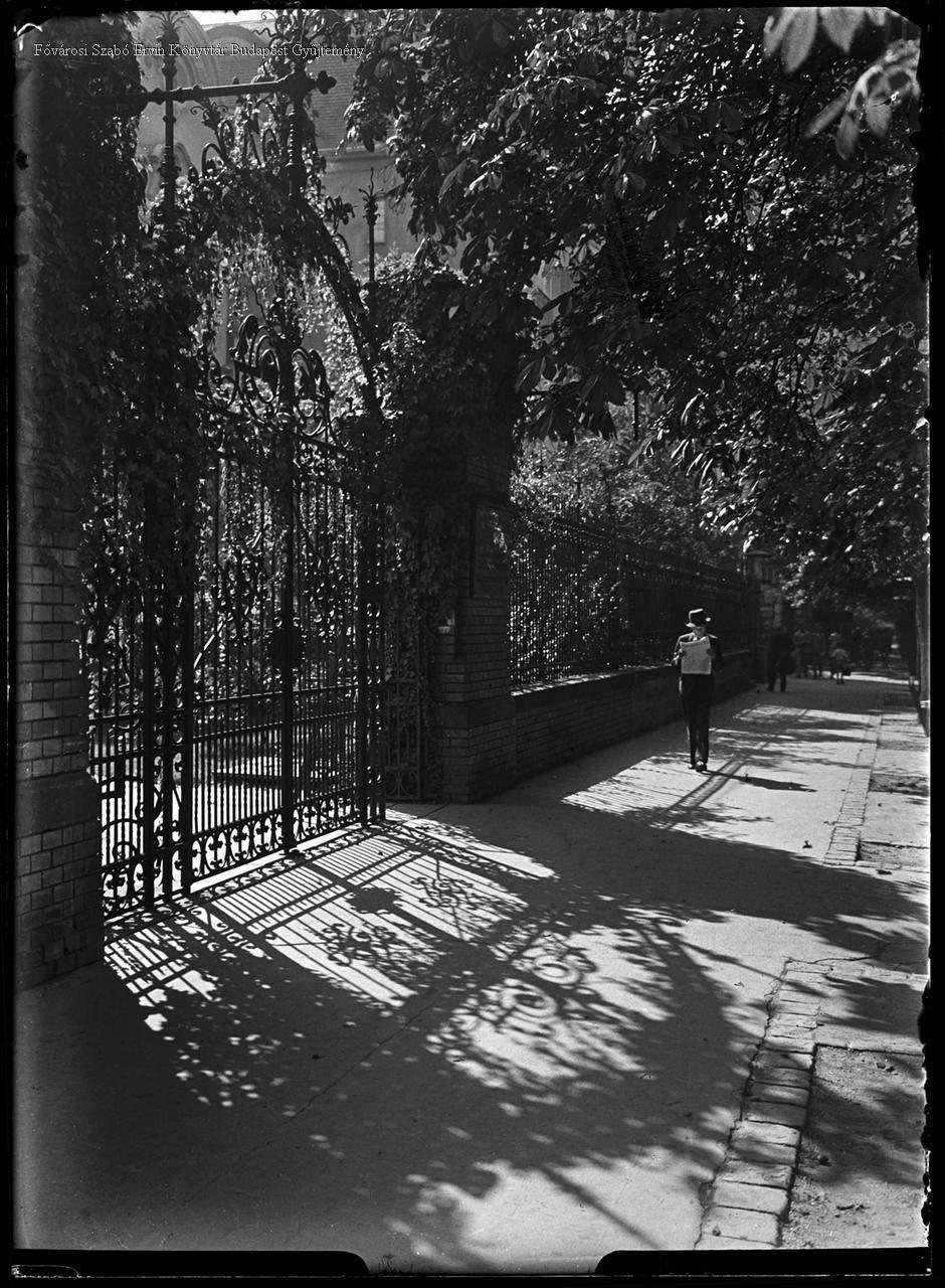 [Járókelők egy villa díszrácsos kapuja előtt] [árnyékok]