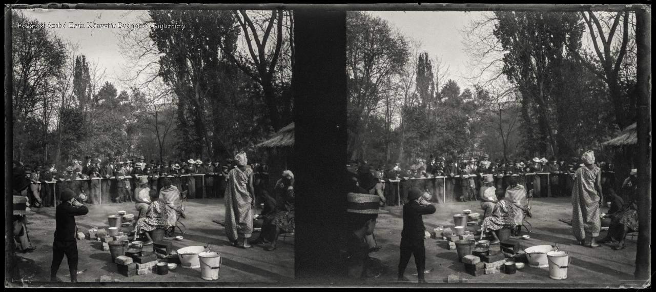 állatkert, növényzet, fa, bemutató, néprajz, szociáldarwinizmus, helyi kultúra, életmód, kunyhó, öltözködés, népviselet, néptömeg, ember, férfi, nő, gyermek, kerítés