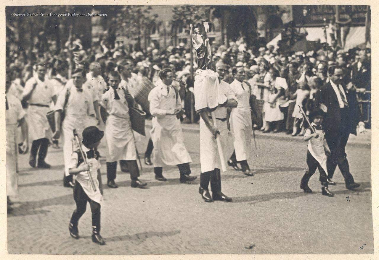 körmenet, katolikus egyház, történeti évforduló, szentek kultusza, keresztény ünnep, augusztus 20., felvonulás, ipartestület, húsipar, ünneplő ruha, gyermek, 1930, Horthy-korszak, sajtófotó