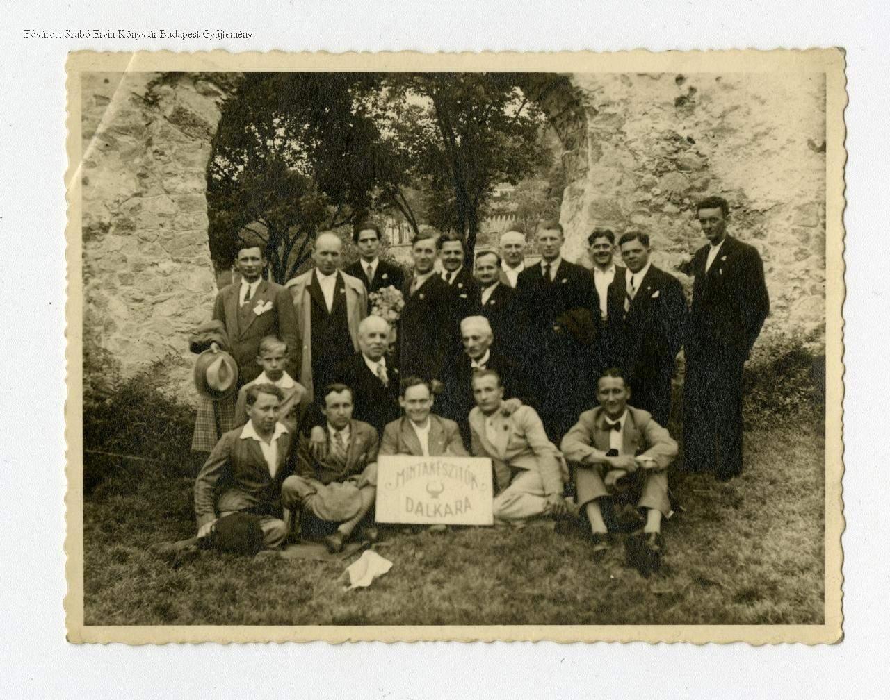 munkásdalárda, munkás, énekkar, férfikar, szabadidő, szórakozás, kirándulás, épületmaradvány, amatőr, művészeti mozgalom, férfi, csoportkép, 1930-as évek