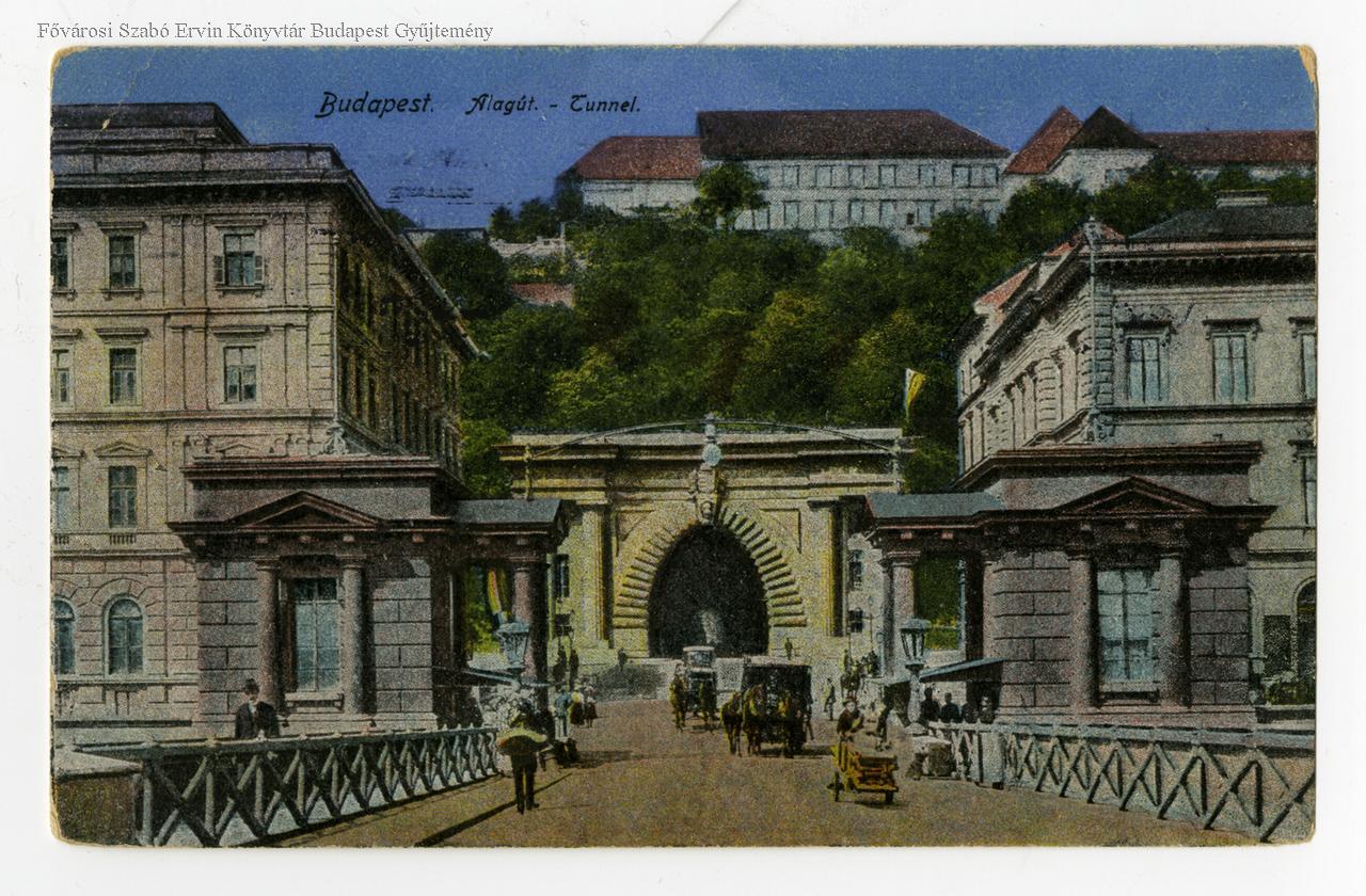 alagút, képes levelezőlap, középület, utcakép, hídfő, vám, közlekedési jegy, díjbeszedés, hídvámkezelő épület, 1910-es évek