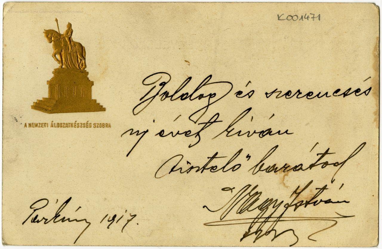 A hátoldalon felhívás a lovasszobron elhelyezendő fémlemez megváltására