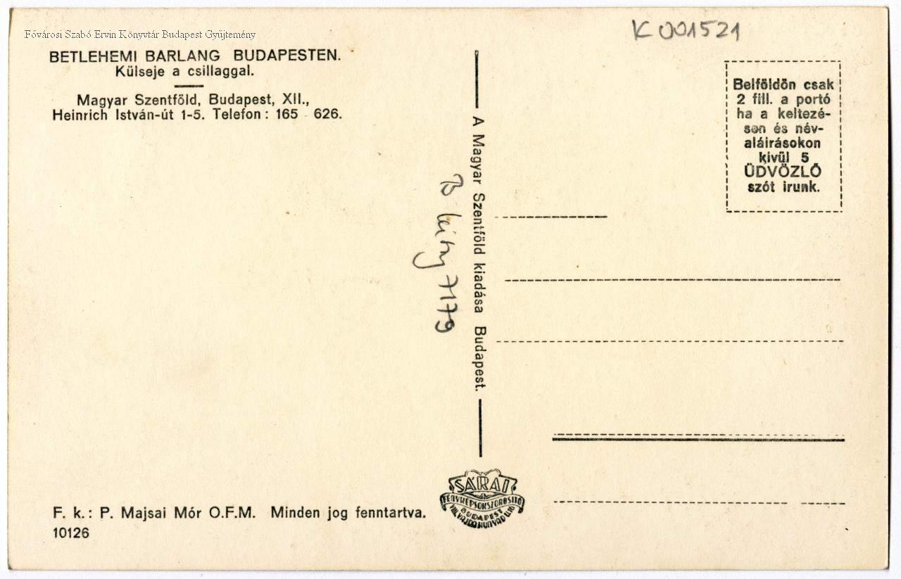 A nyomda címe a hátoldalon feltüntetve: Budapest VIII. Vajdahunyad u. 16.