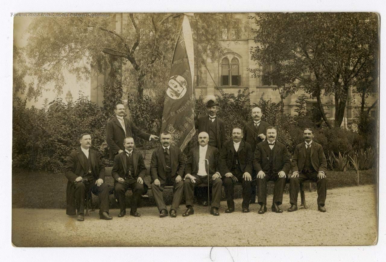 érdekképviselet, egyesület, nyugdíjbiztosítás, önsegélyezés, férfi, zászló, fa, park, képes levelezőlap, külső felvétel, csoportkép, 1910-es évek