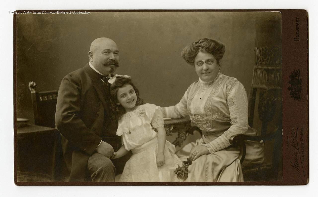 [Ülő férfi és nő, közöttük egy kislány, (nagyszülők és unoka?) műtermi fényképe]