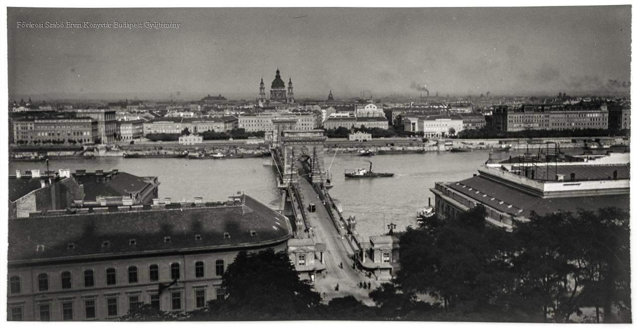[Pesti látkép a Várhegy felől a Lánchíddal - Dunai látkép] [View of Pest from the Castle Hill with the Chain Bridge - View of the Danube]