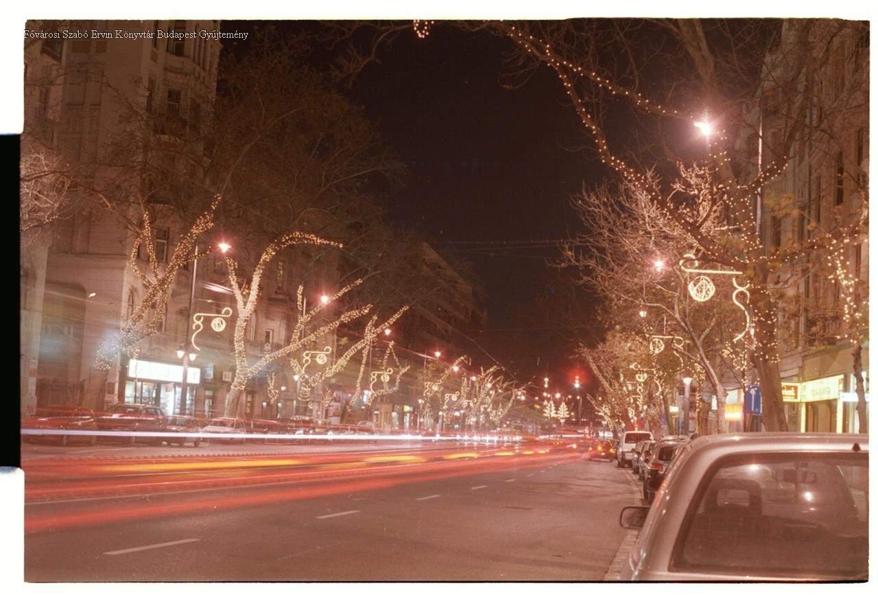 külső felvétel, utcakép, épületkép, este, közvilágítás, kivilágítás, karácsony, fa, személygépkocsi, 2000-es évek