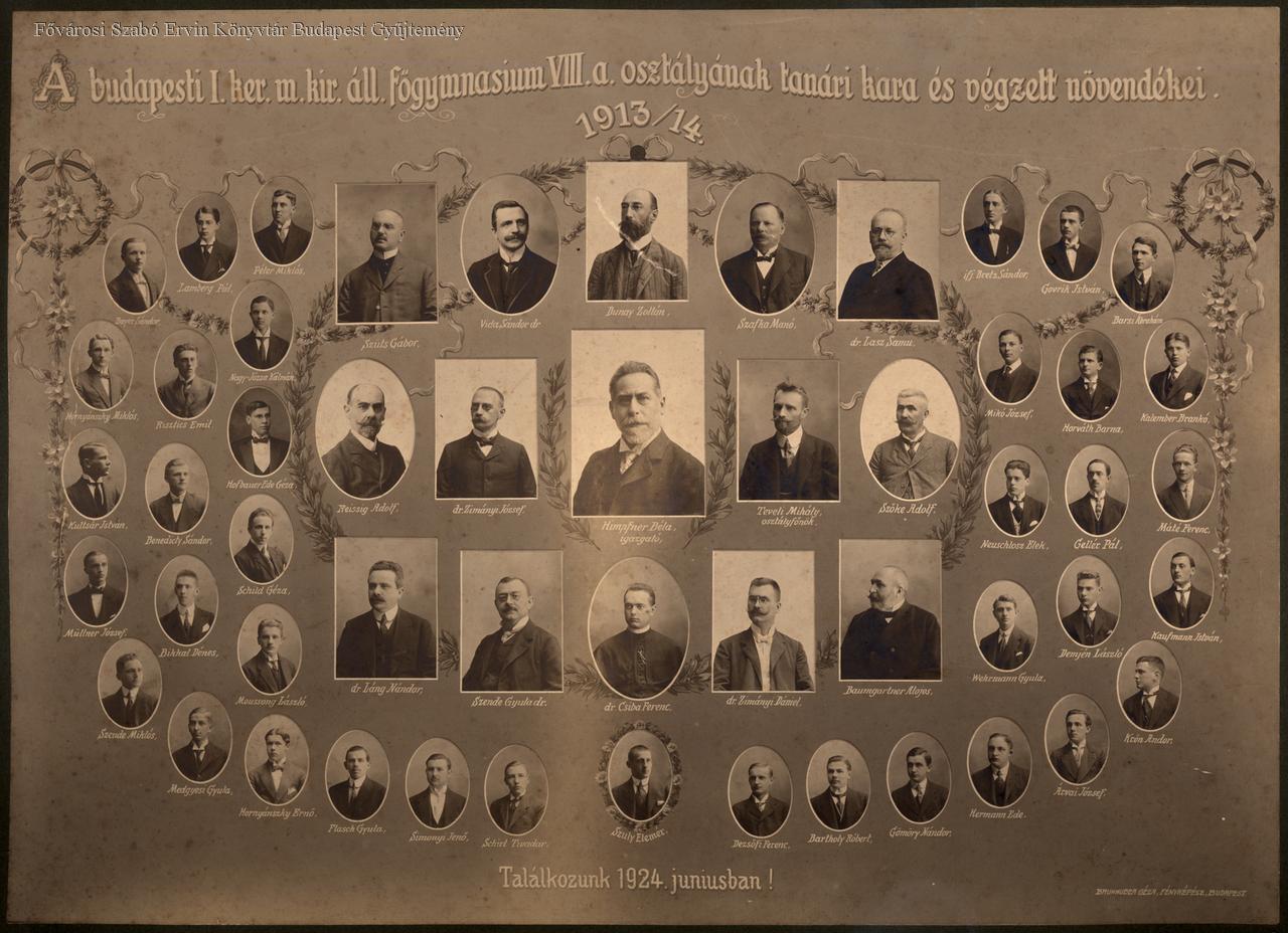 A budapesti I. ker. m. kir. áll. főgymnasium VIII. a. osztályának tanári kara és végzett növendékei.1913/14.