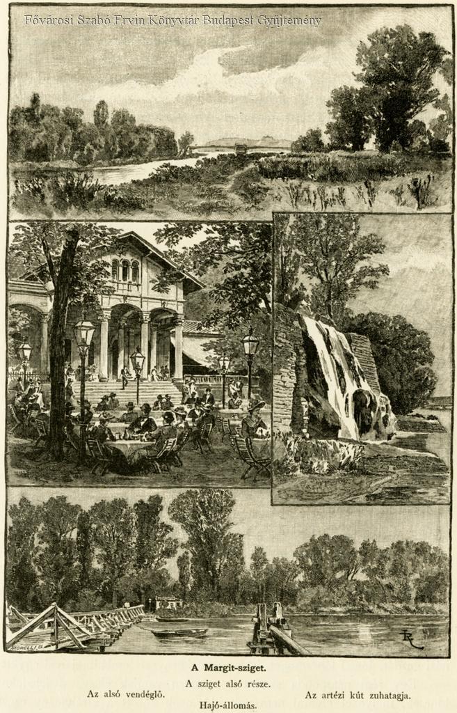 Margitsziget A sziget déli csúcsa, az alsó vendéglő, az artézi forrás vízesése, a hajóállomás fahídja /