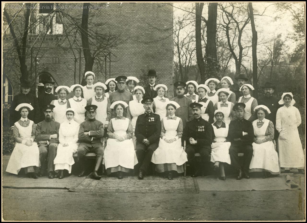 első világháború, csoportkép, hadirokkant, jótékonyság, külföldi, vöröskereszt, hollandok, ápolónő, egyenruha, orvos, kórház, udvar, 1916