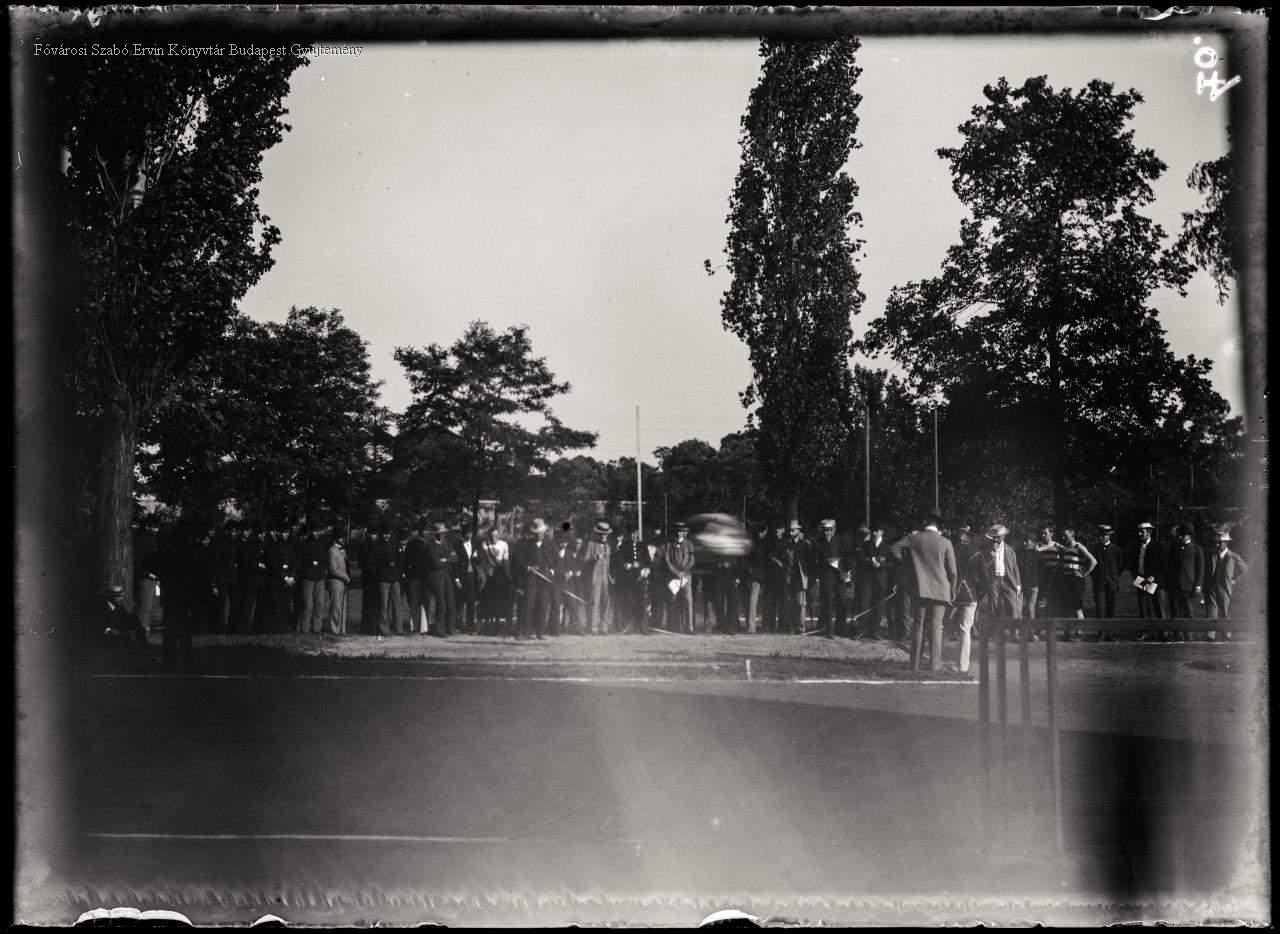 [Sportpálya. Rúdugrót figyelő elegáns urak] [Sports field. Elegant gentlemen watching the high jumper]
