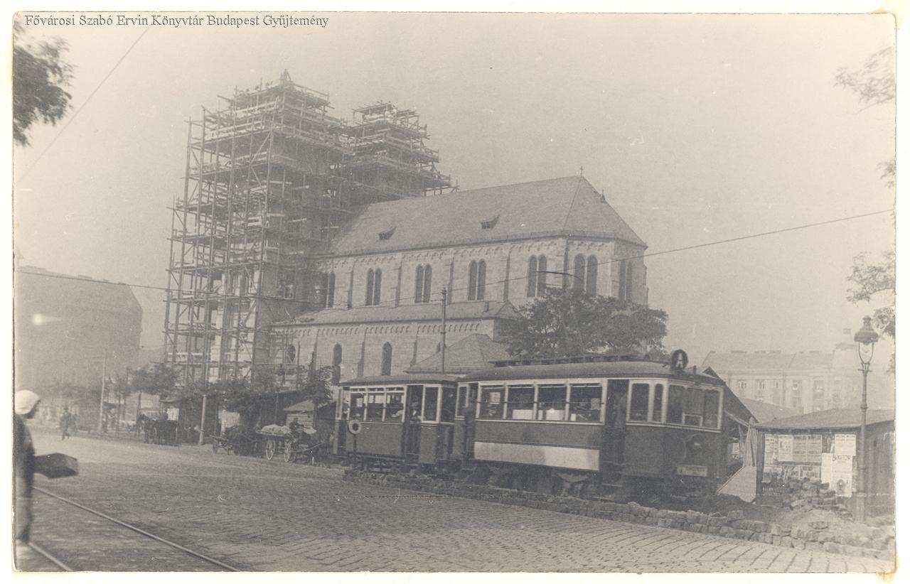 templom, neoromán, katolikus egyház, építés, állvány, közúti villamosvasút, épületkép, külső felvétel, 1932 körül