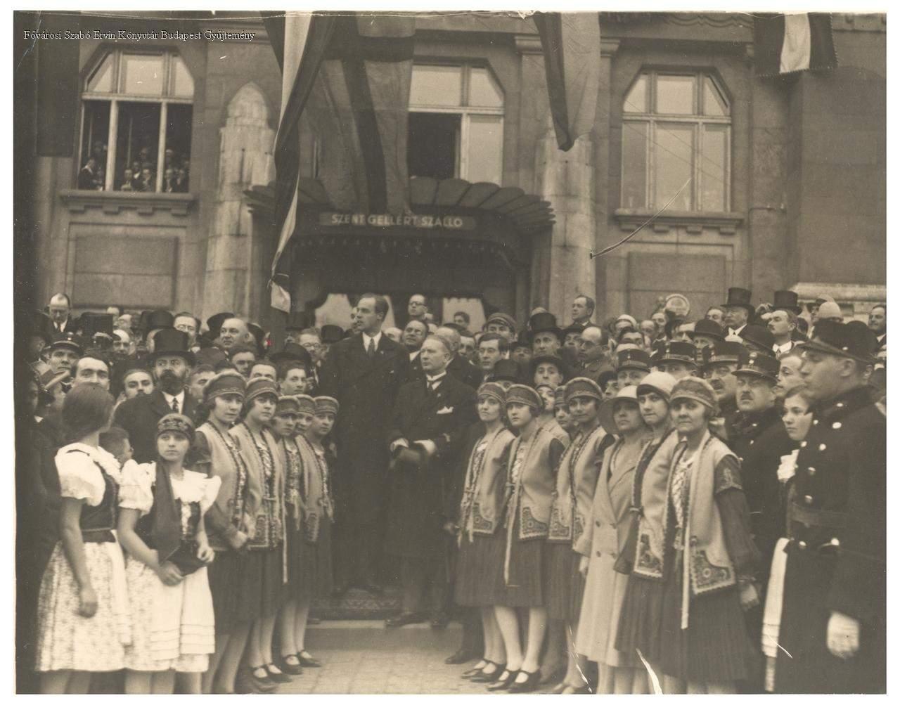 A Gellért szálló főbejárata előtt középen magaslik Lord Rothermere fia, aki a tiszteletére rendezett felvonulást tekinti meg.