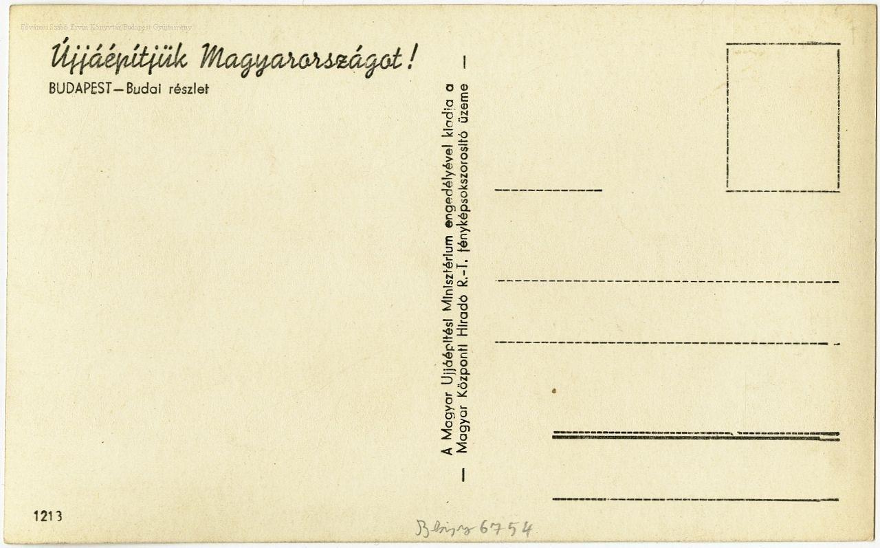Kiadási adat a képeslapon: A Magyar Ujjáépítési Minisztérium engedélyével kiadja a Magyar Központi Híradó R.-T. fényképsokszorosító üzeme