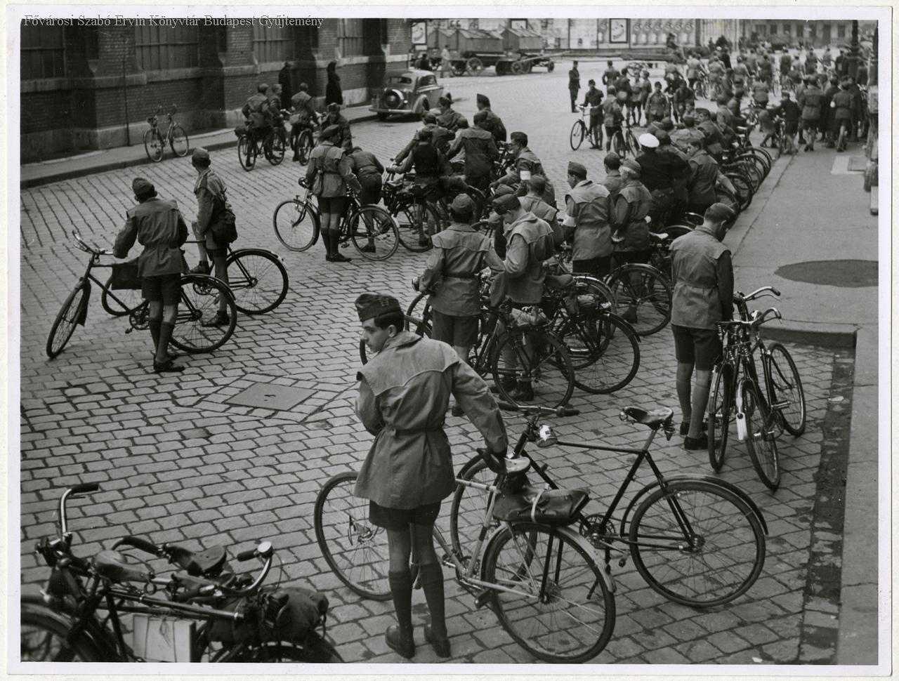 [Kerékpáros cserkészek gyülekezése a Nagyvásárcsarnok mellett]