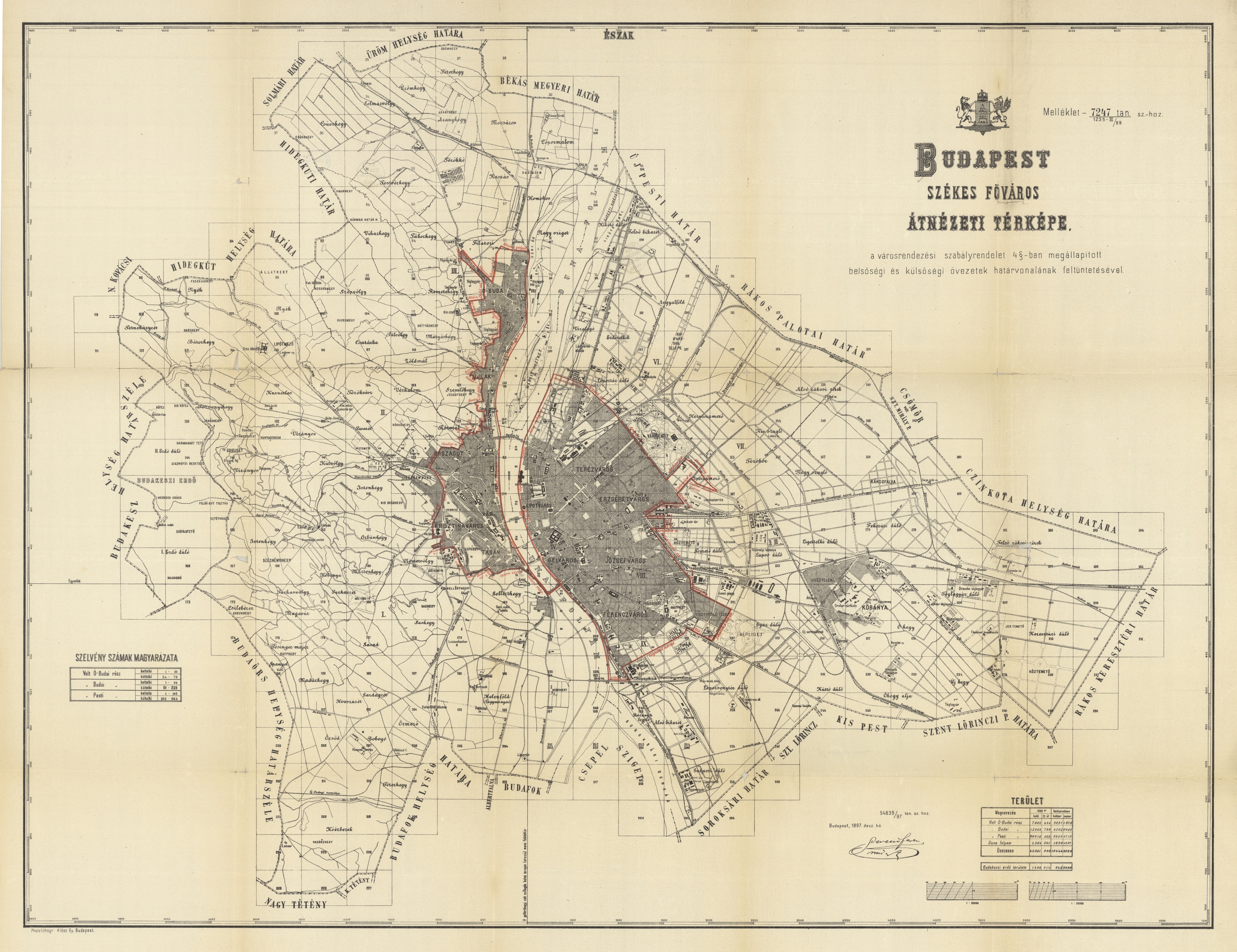 Budapest székes főváros átnézeti térképe, a városrendezési szabályrendelet 4.-ban megállapított belsőségi és külsőségi övezetek határvonalának feltüntetésével