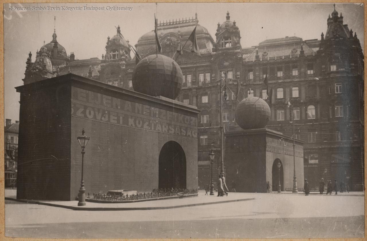 jelenetkép, Tanácsköztársaság, május 1., ünnepség, dekoráció, politikai propaganda, munkásmozgalom, jelkép, 1919