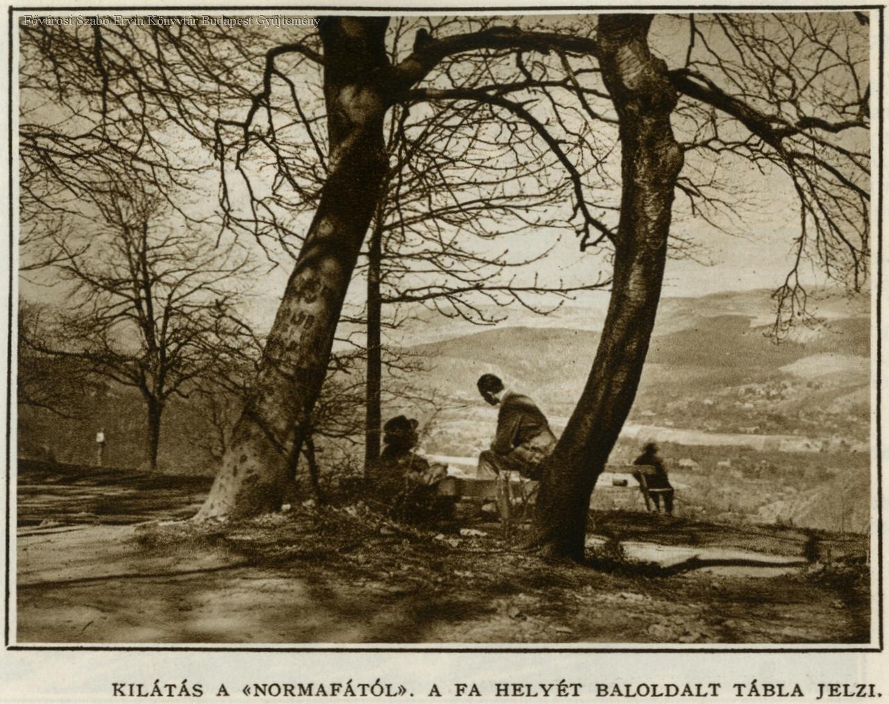 Kilátás a Normafától a fa helyét baloldalt tábla jelzi