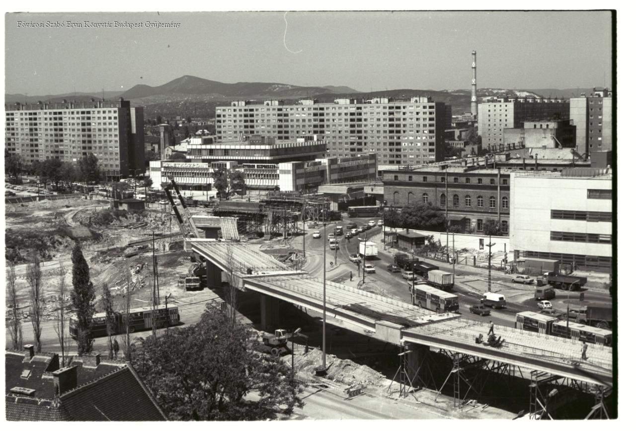 külső felvétel, látkép, felüljáró, aluljáró, lakótelep, építés, állvány, daru, személygépkocsi, tehergépkocsi, 1980-as évek