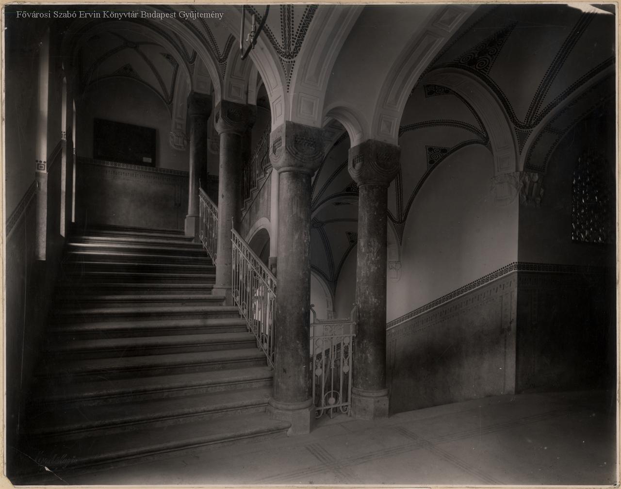 általános iskola, lépcsőház, tartóoszlop, vasművesség, korlát, épületkép, belső felvétel, 1910 körül