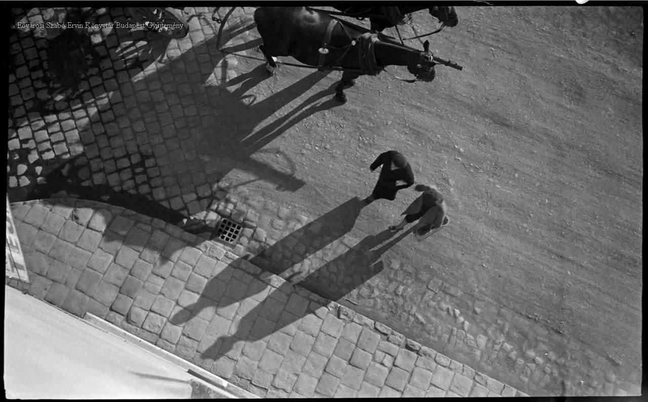 [Járókelők, lovas kocsi] [felülnézet, árnyékok]