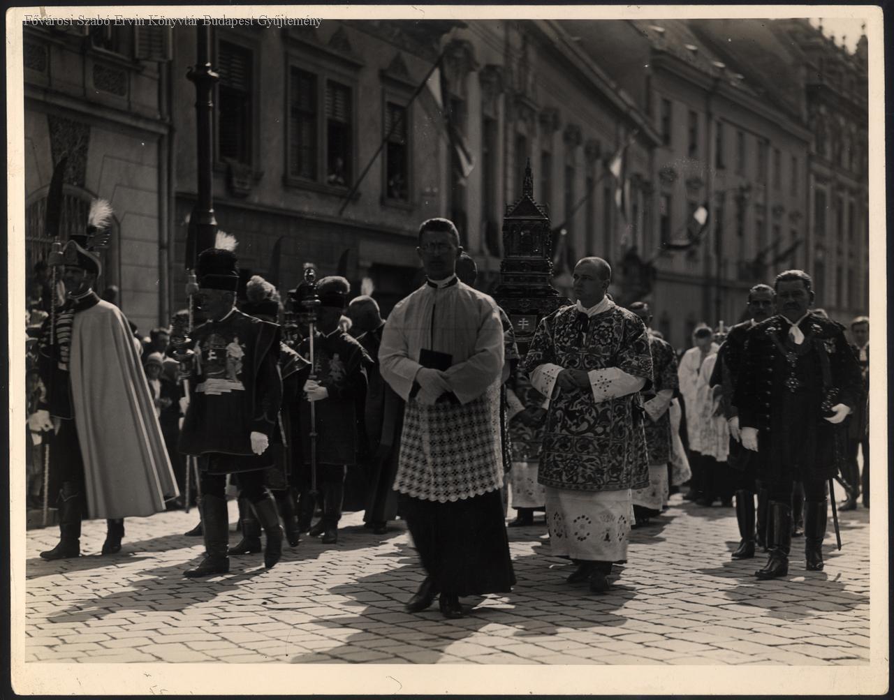 ünnepség, augusztus 20, körmenet, katolikus pap, katolikus egyház, kegytárgy, díszmagyar, testőrség, egyenruha, jelenetkép, 1930-as évek