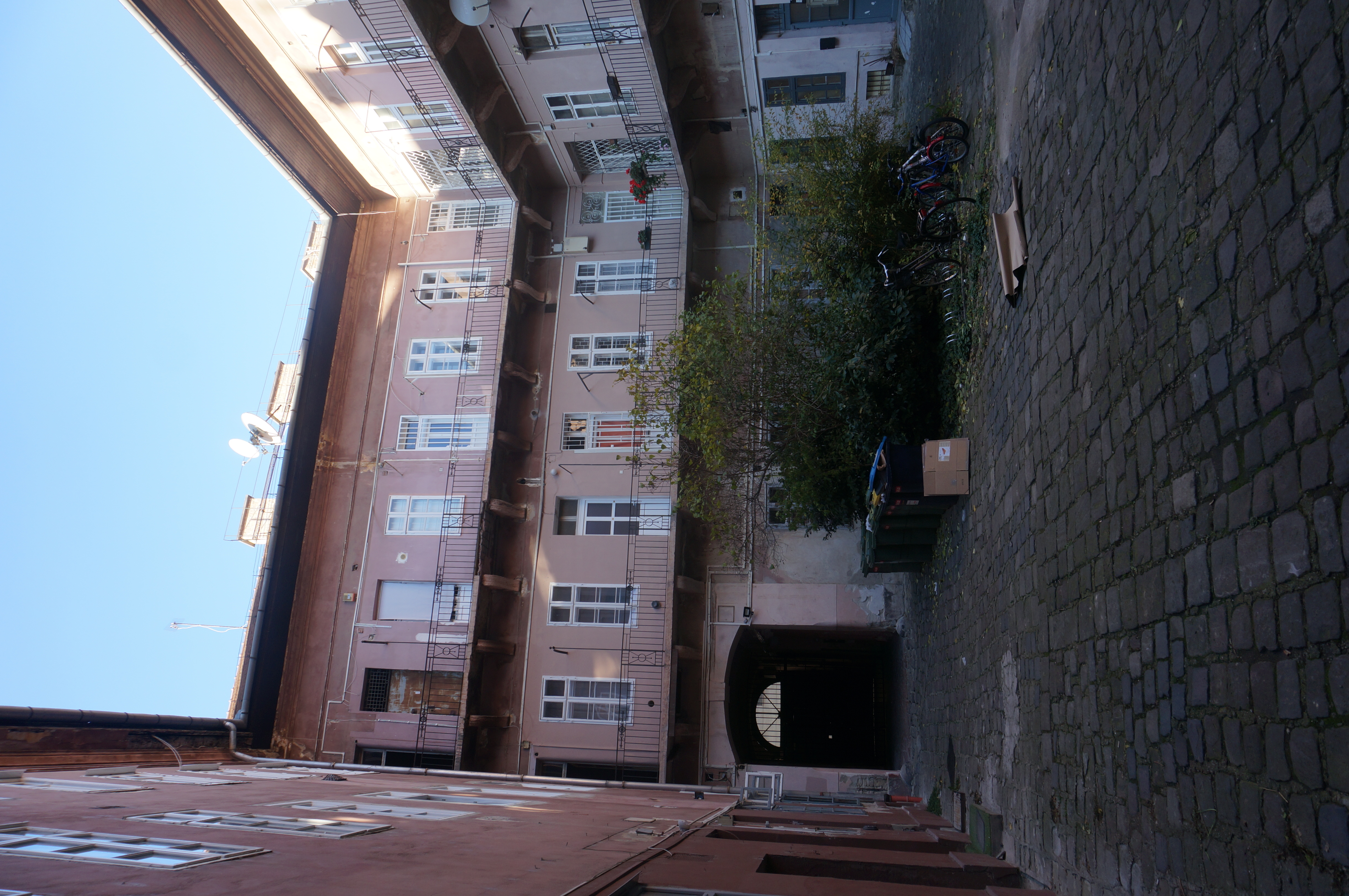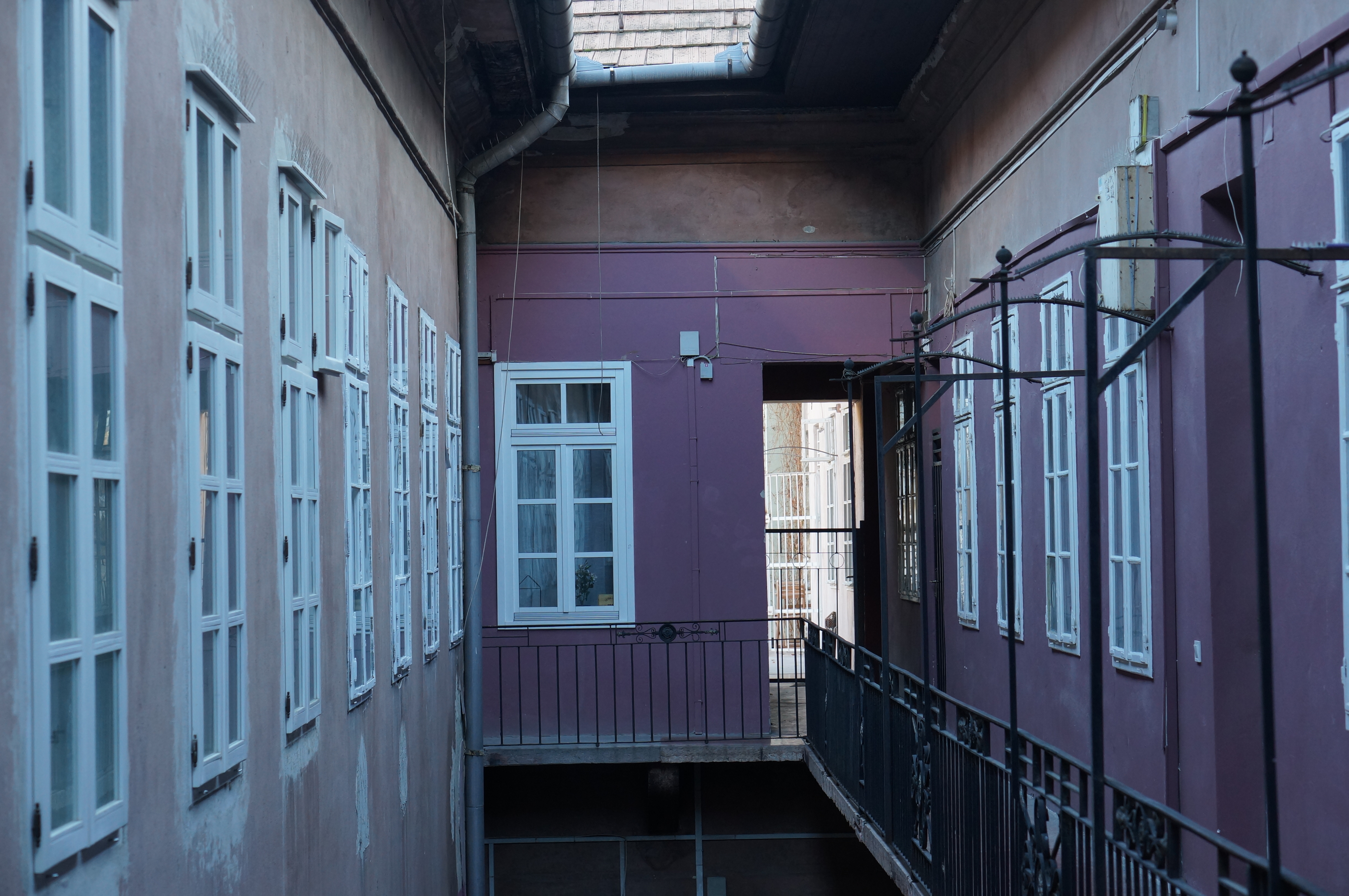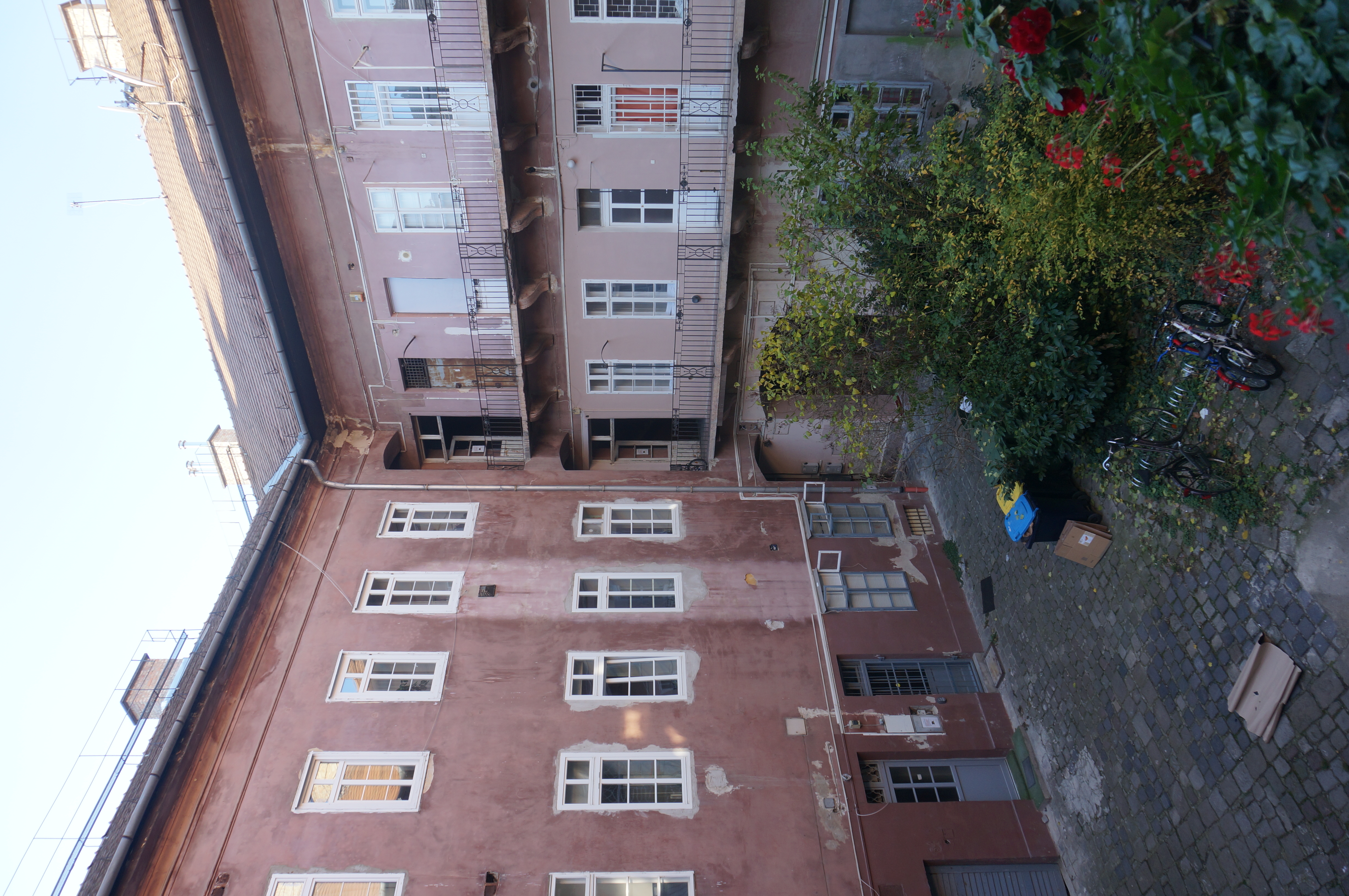 Az épület első és második emeltén gang fut körbe, amelyre a főlépcsőház mellett egy hátsó kisebb lépcsőn is fel lehet jutni, mindkét lépcsőház elhanyagolt benyomást kelt, a vakolat mállik, a világítás gyenge. Az udvari homlokzatokon a külsőhöz hasonló, de jobb állapotú, rózsaszínű festés, amely egyes részeken láthatóan új. Néhány lakáson a nyílászárók cseréje is megtörtént, és madarak elleni védelmet szereltek fel. A falakon kábelcsatornák futnak, a vezetékek néhány helyen lógnak. A gangok üresek, rendezettek, a közlekedés mindenhol biztosított, a haladást semmi nem akadályozza, ugyanezért az egész épület túlságosan sterilnek hat, mintha lakatlan lenne. A valóságban persze nem az, egy takarítónő és egy a gangon körbe-körbe sétáló bácsi jelezte, hogy a lakásokat többféleképpen használják.