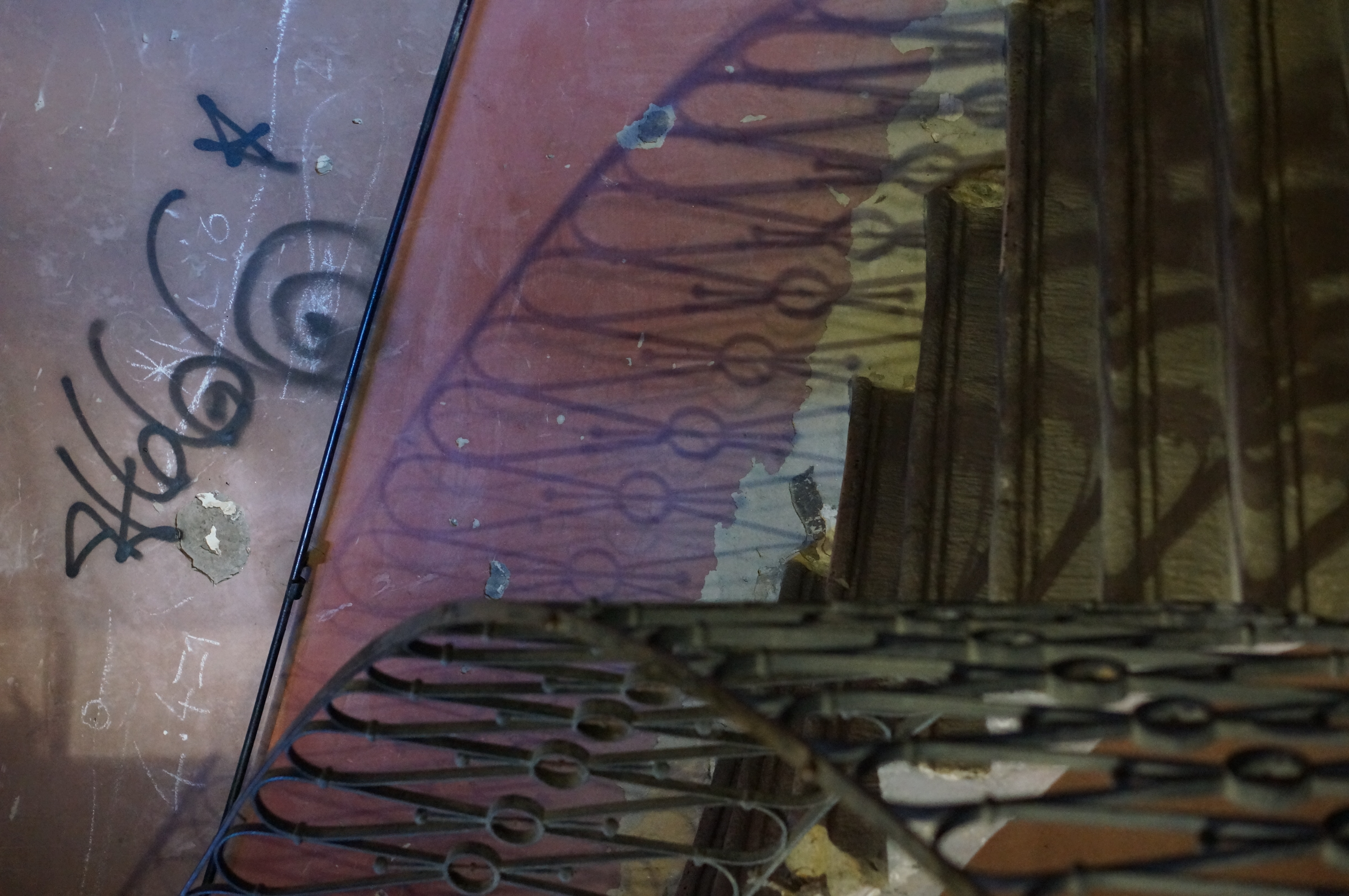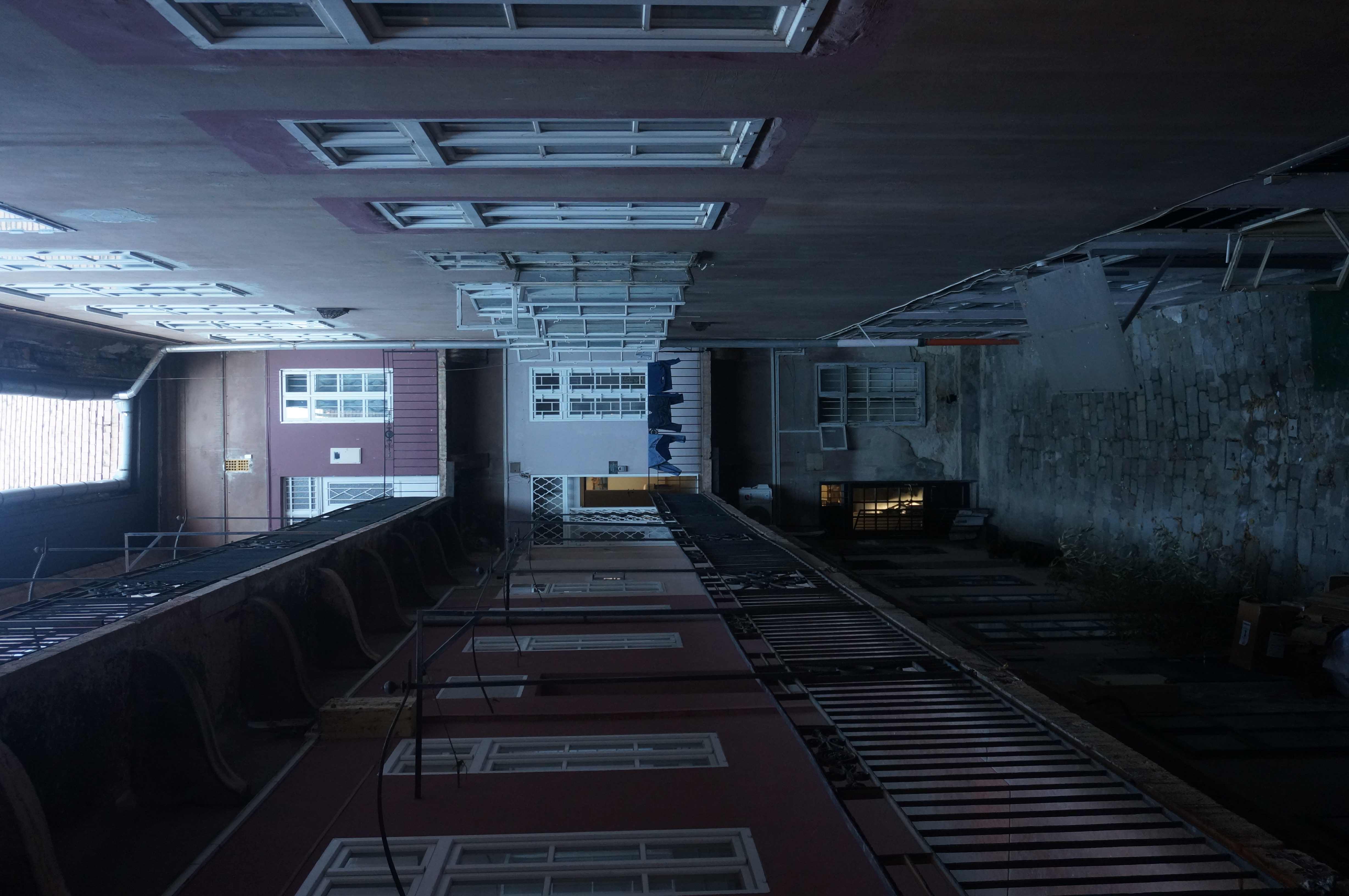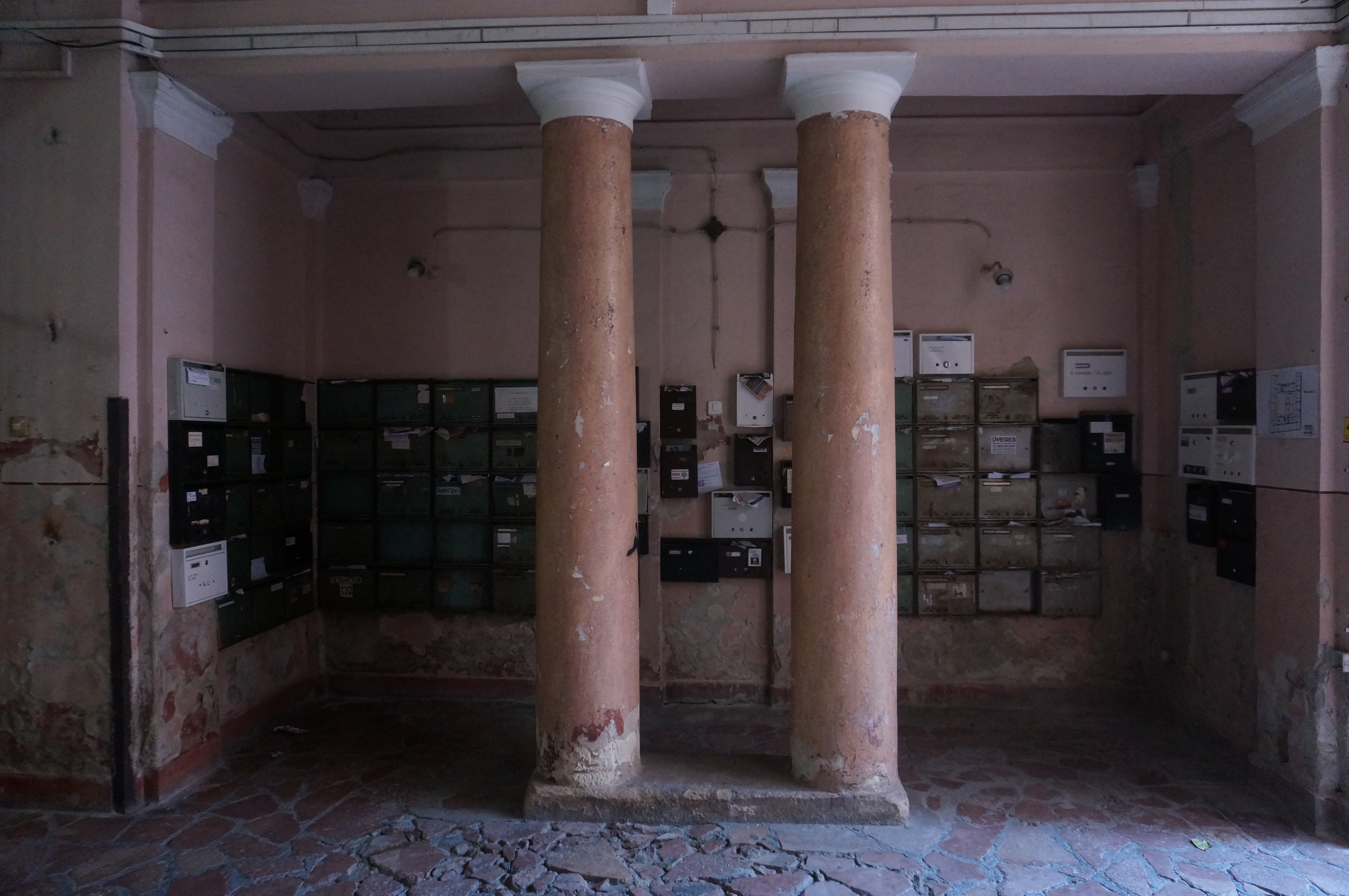 Az épület első és második emeltén gang fut körbe, amelyre a főlépcsőház mellett egy hátsó kisebb lépcsőn is fel lehet jutni, mindkét lépcsőház elhanyagolt benyomást kelt, a vakolat mállik, a világítás gyenge. Az udvari homlokzatokon a külsőhöz hasonló, de jobb állapotú, rózsaszínű festés, amely egyes részeken láthatóan új. Néhány lakáson a nyílászárók cseréje is megtörtént, és madarak elleni védelmet szereltek fel. A falakon kábelcsatornák futnak, a vezetékek néhány helyen lógnak. A gangok üresek, rendezettek, a közlekedés mindenhol biztosított, a haladást semmi nem akadályozza, ugyanezért az egész épület túlságosan sterilnek hat, mintha lakatlan lenne. A valóságban persze nem az, egy takarítónő és egy a gangon körbe-körbe sétáló bácsi jelezte, hogy a lakásokat többféleképpen használják.