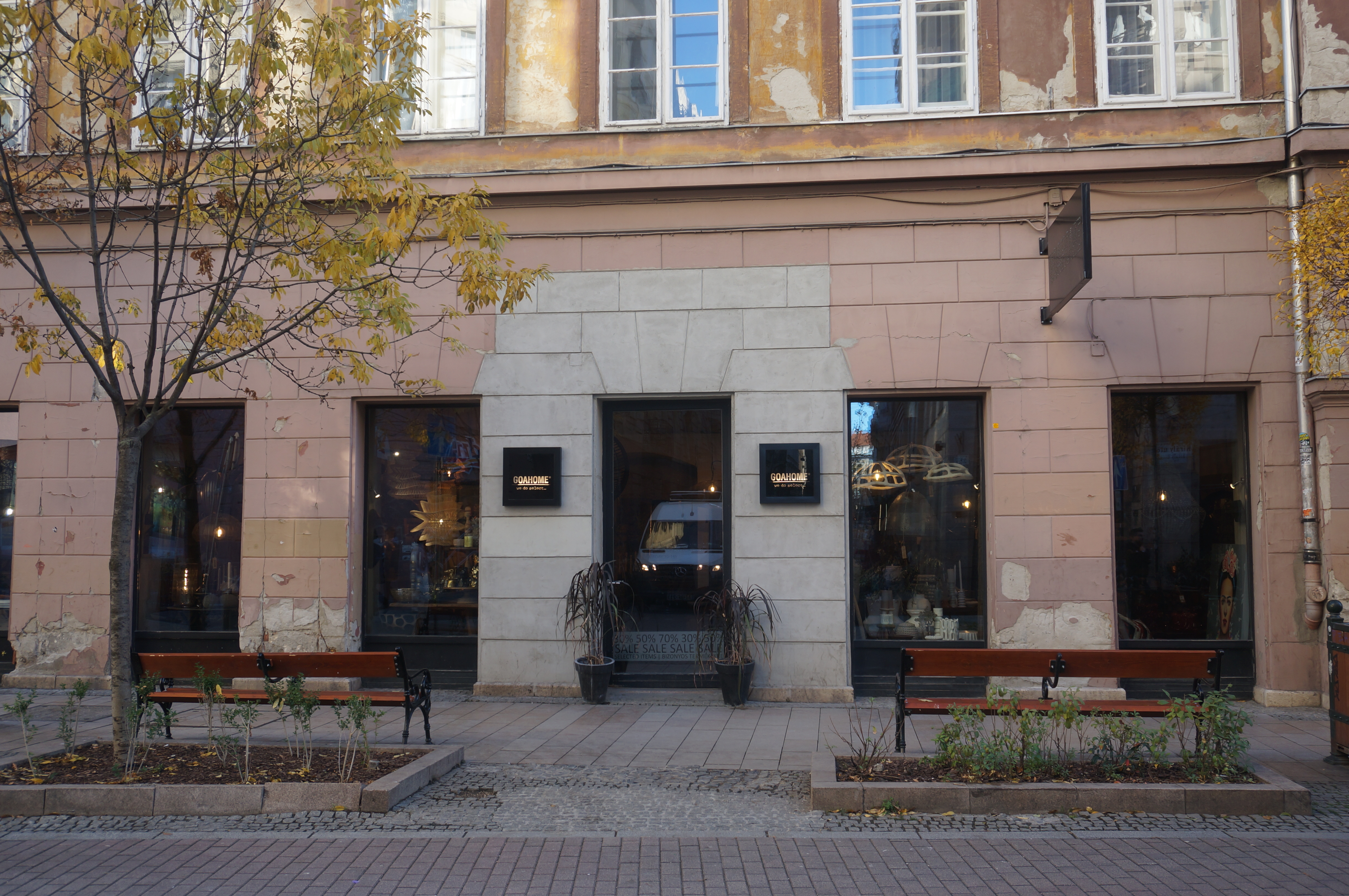 Az utcai homlokzatokon a földszintet üzlethelyiségek foglalják el. A Király utcát egy lakberendezési áruház, a Goa Home uralja, mellette csak egy kisebb, éjjel-nappal nyitva tartó élelmiszerüzletnek jutott hely. A Kazinczy utcai homlokzaton régebben nem lehettek üzletek, az itteni bolthelyiségeket - az egyikben ma görög gyorsétterem működik, a másik üresen áll -valószínűleg földszinti udvari üzletekből vagy lakásokból nyitották ki az utca felé.