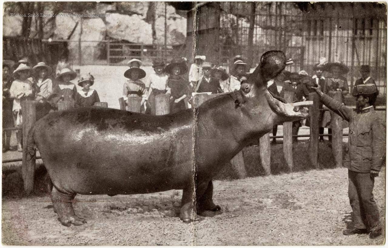 állatkert, víziló, nézők, állatgondozó, képes levelezőlap, 1913