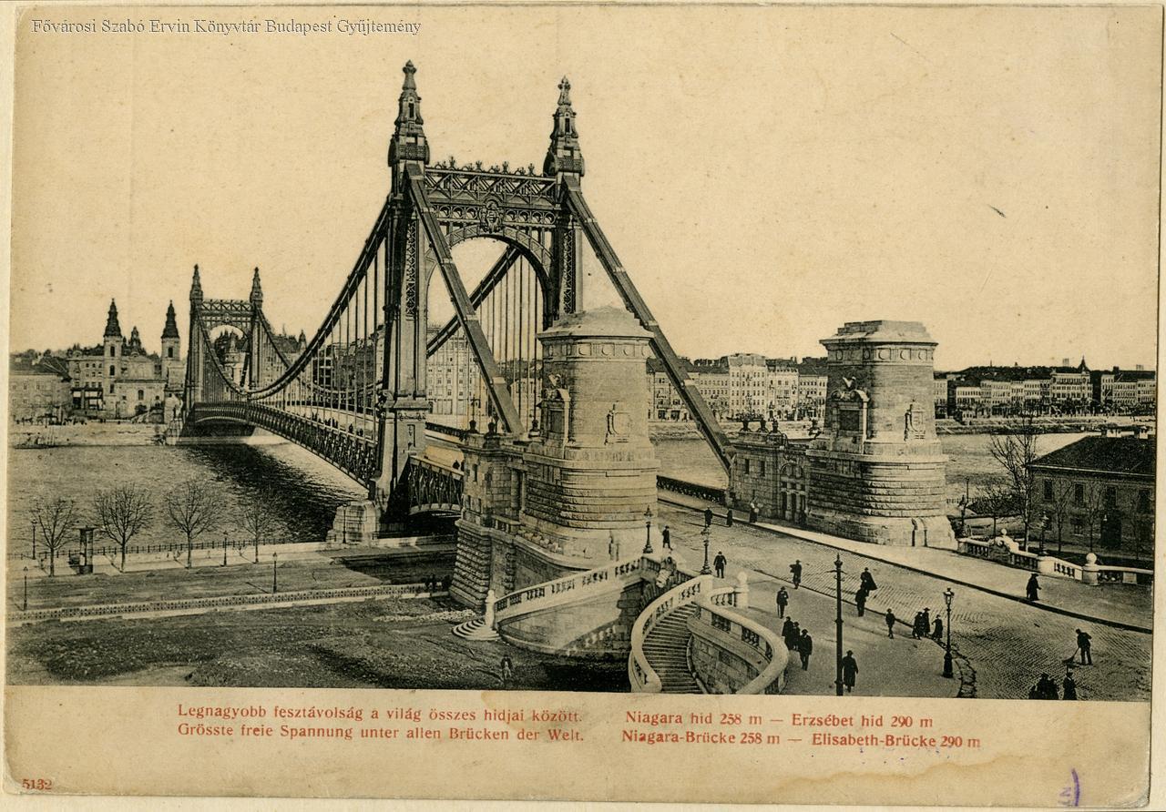 Legnagyobb fesztávolság a világ összes hídjai között = Grösste freie Spannung unter allen Brücken der Welt Niagara híd 258 m - Erzsébet híd 290 m = Niagara-Brücke 258 m - Elisabeth-Brücke 290 m