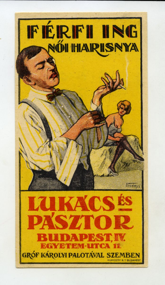 fehérnemű, ing, harisnya, férfi, nő, szexualitás, cigaretta, dohányzás, üzlet, reklámnyomtatvány, kisnyomtatvány, aprónyomtatvány, számolócédula