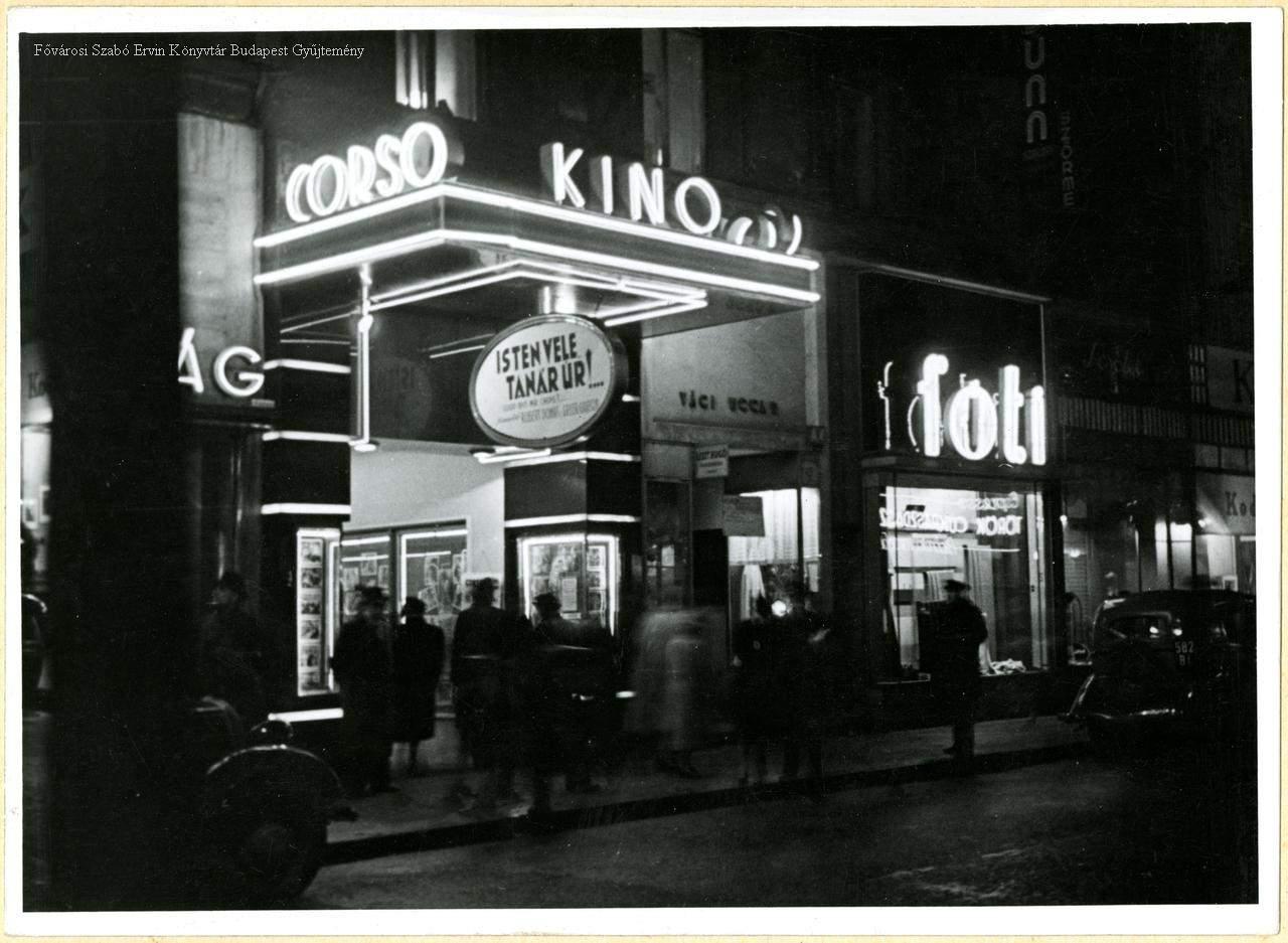 A bejárat fölött hirdetett "Isten vele tanár úr!..." című film bemutatója 1939. október 16-án volt a moziban