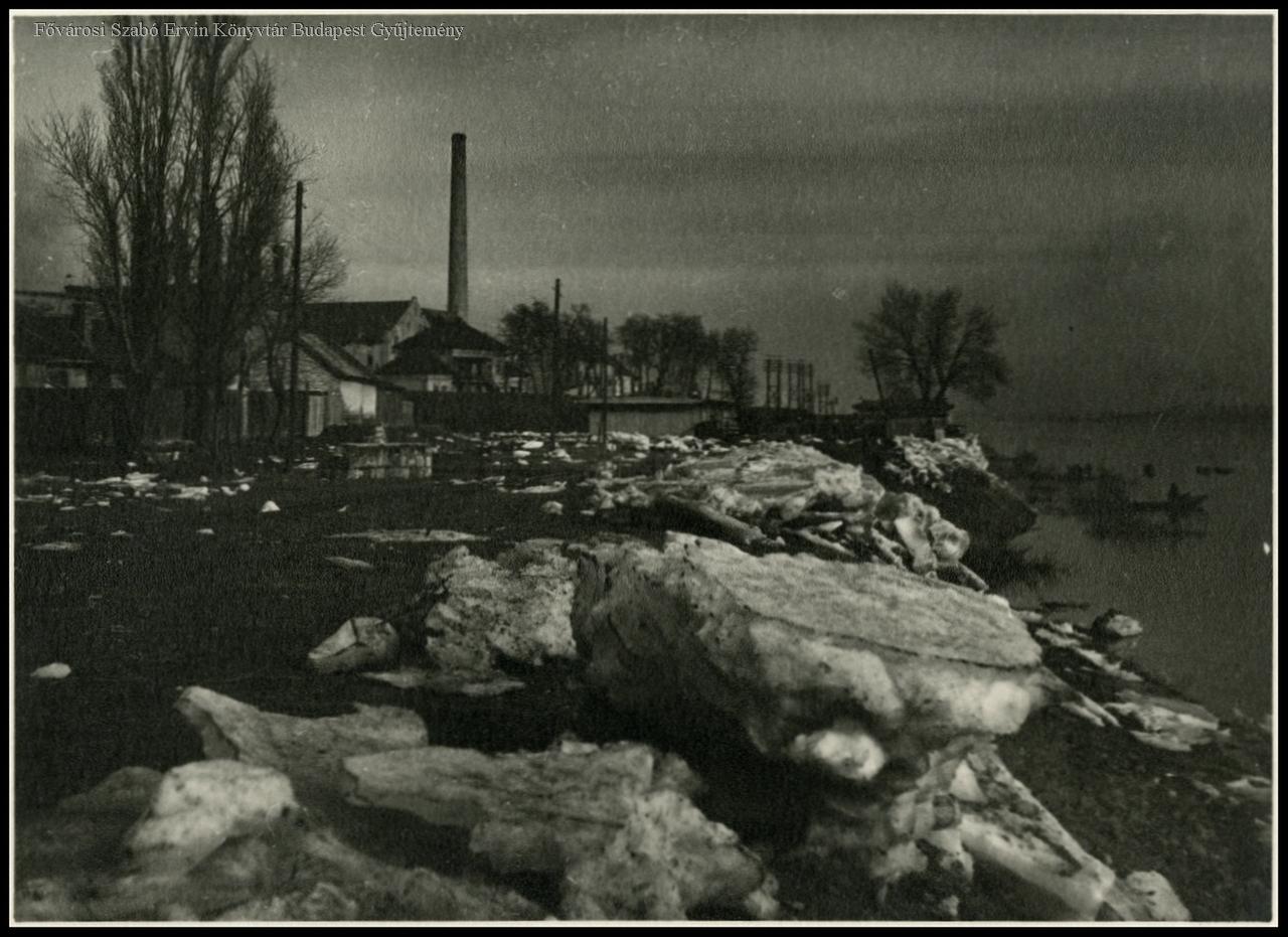Előtérben jeges, elárasztott terület, mögötte valószinű a Gyár utca gyárkéményei.