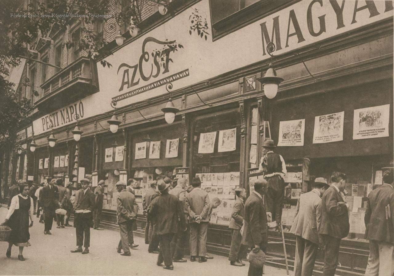 1925, szerkesztőség, homlokzat, portál, kirakat, cégtábla, fényreklám, neon, lámpa, este, éjjel, külső felvétel