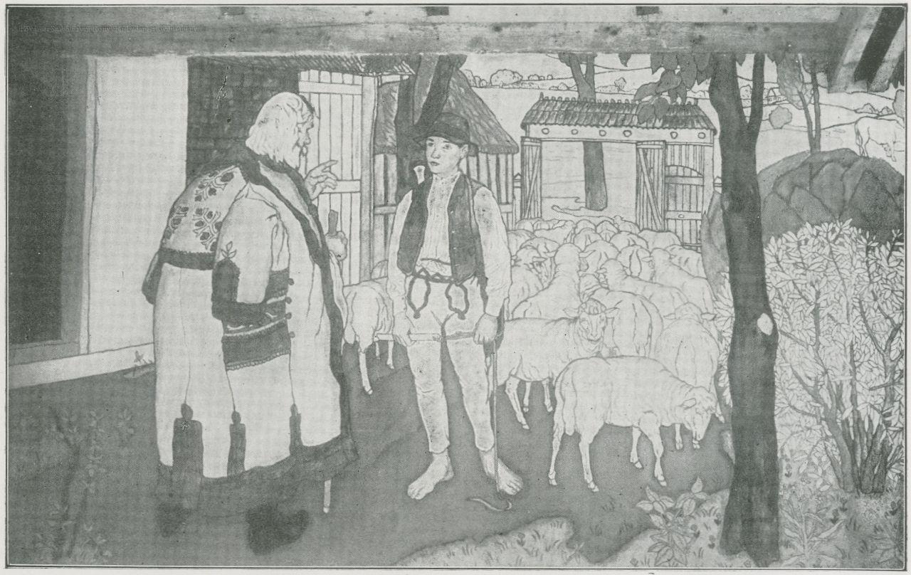 általános iskola, elemi iskola, óvoda, épületdíszítés, falfestmény, mese, jelenetkép, juhász, nyáj, belső felvétel, 1909